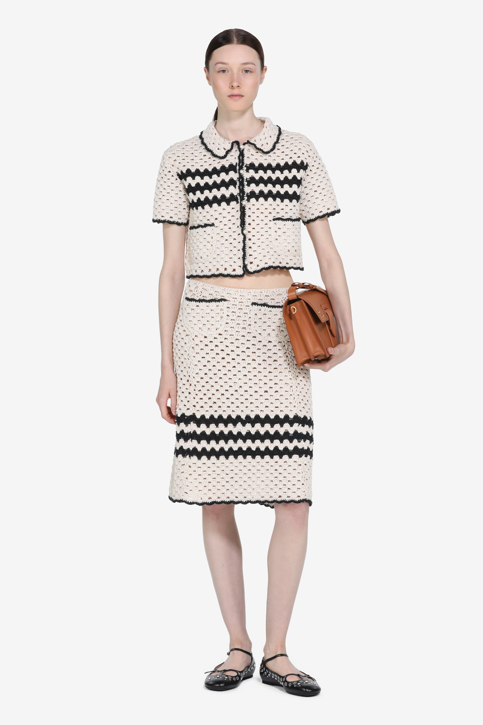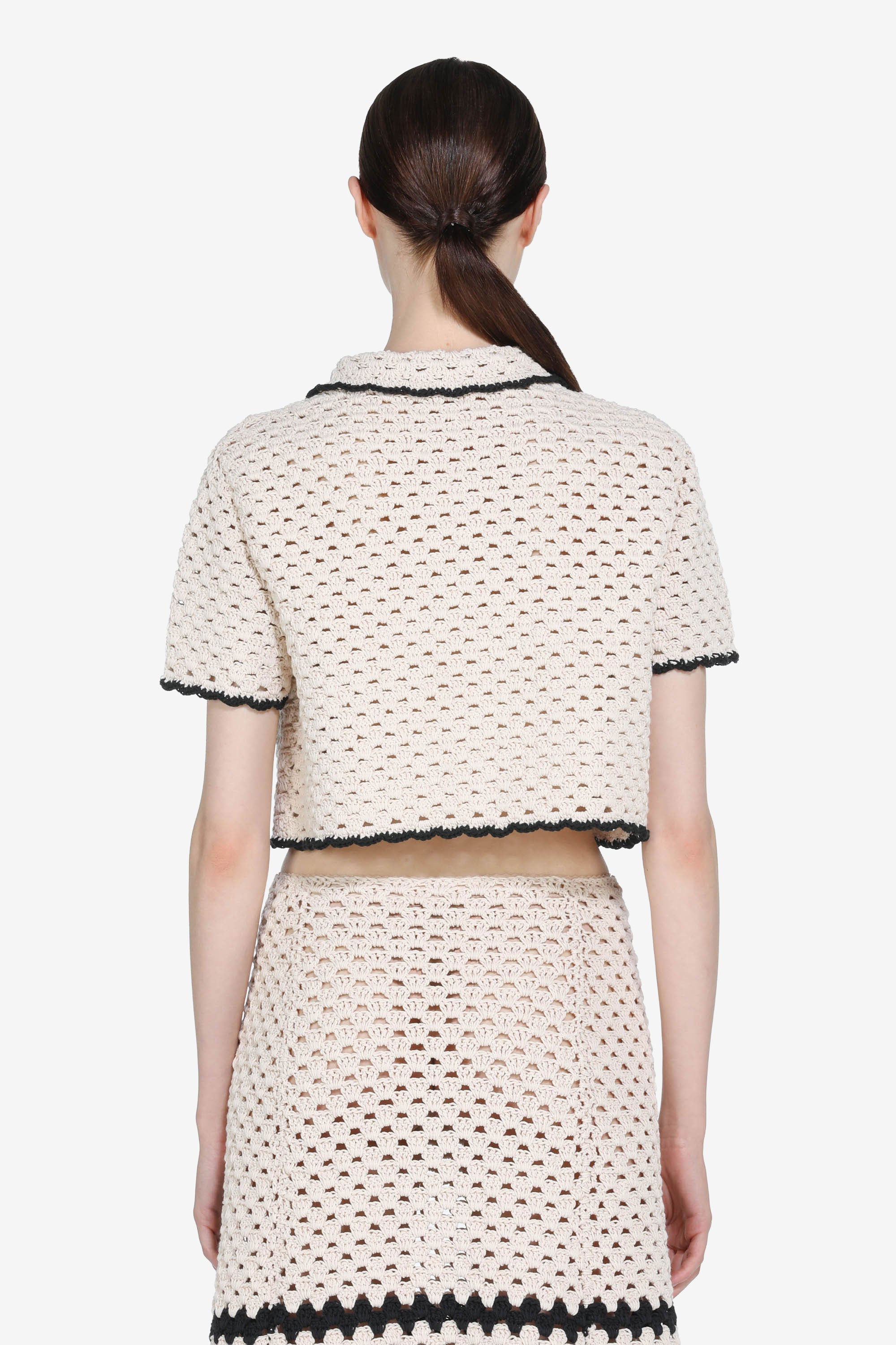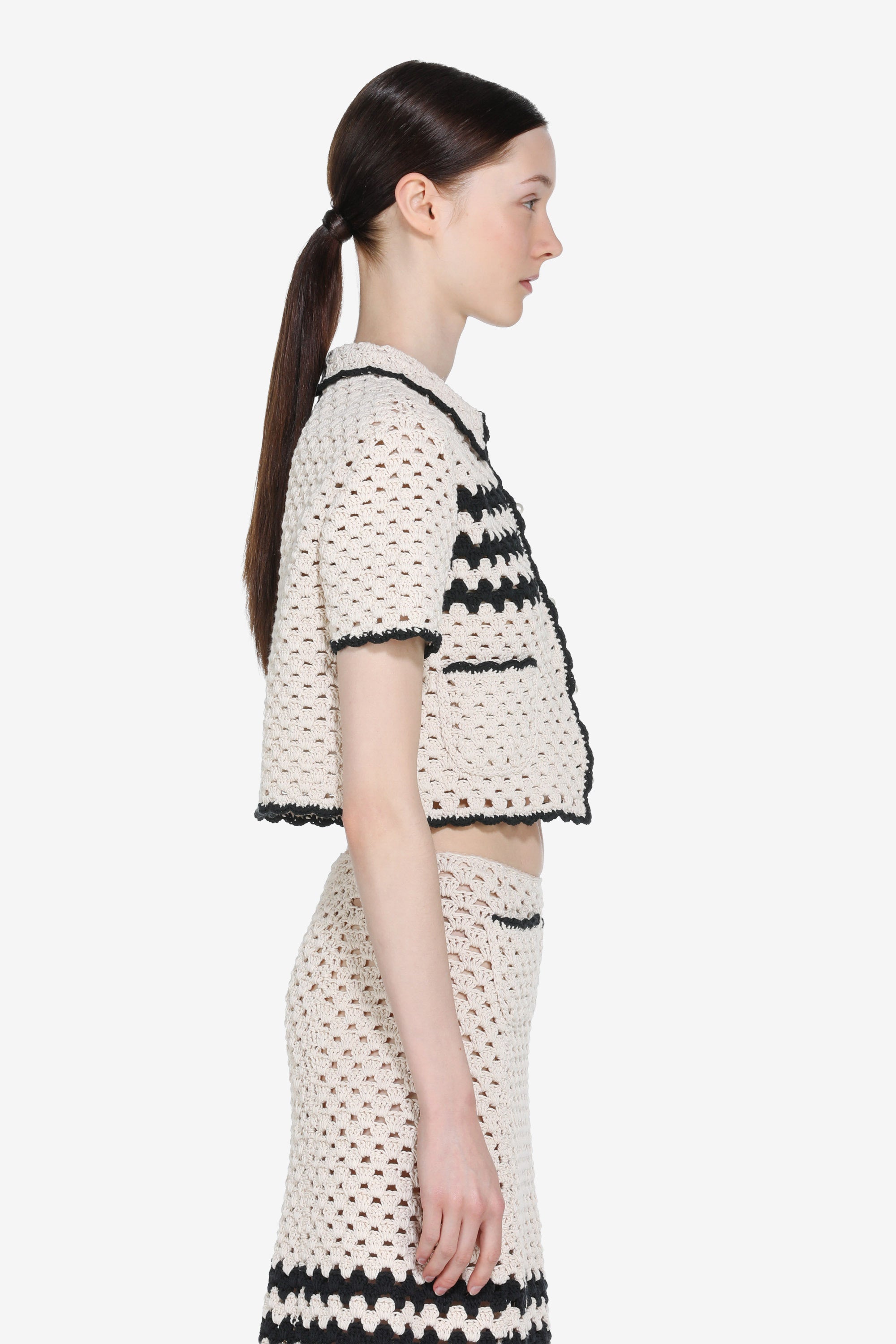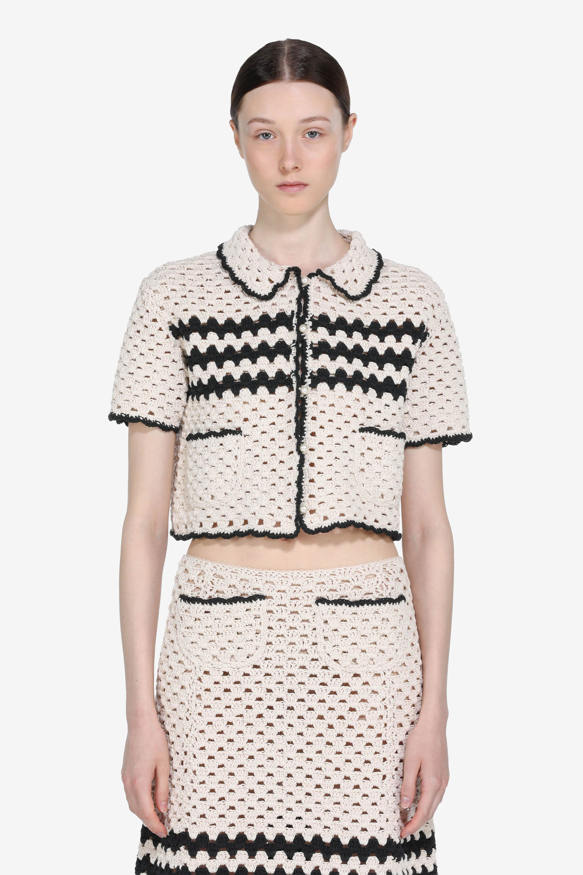 Cropped crochet cardigan with a cream lace pattern. Contrasting black details along the front seams, collar, and hem. Short sleeves and two front pockets with button closures. Crochet detailing creates a decorative effect.