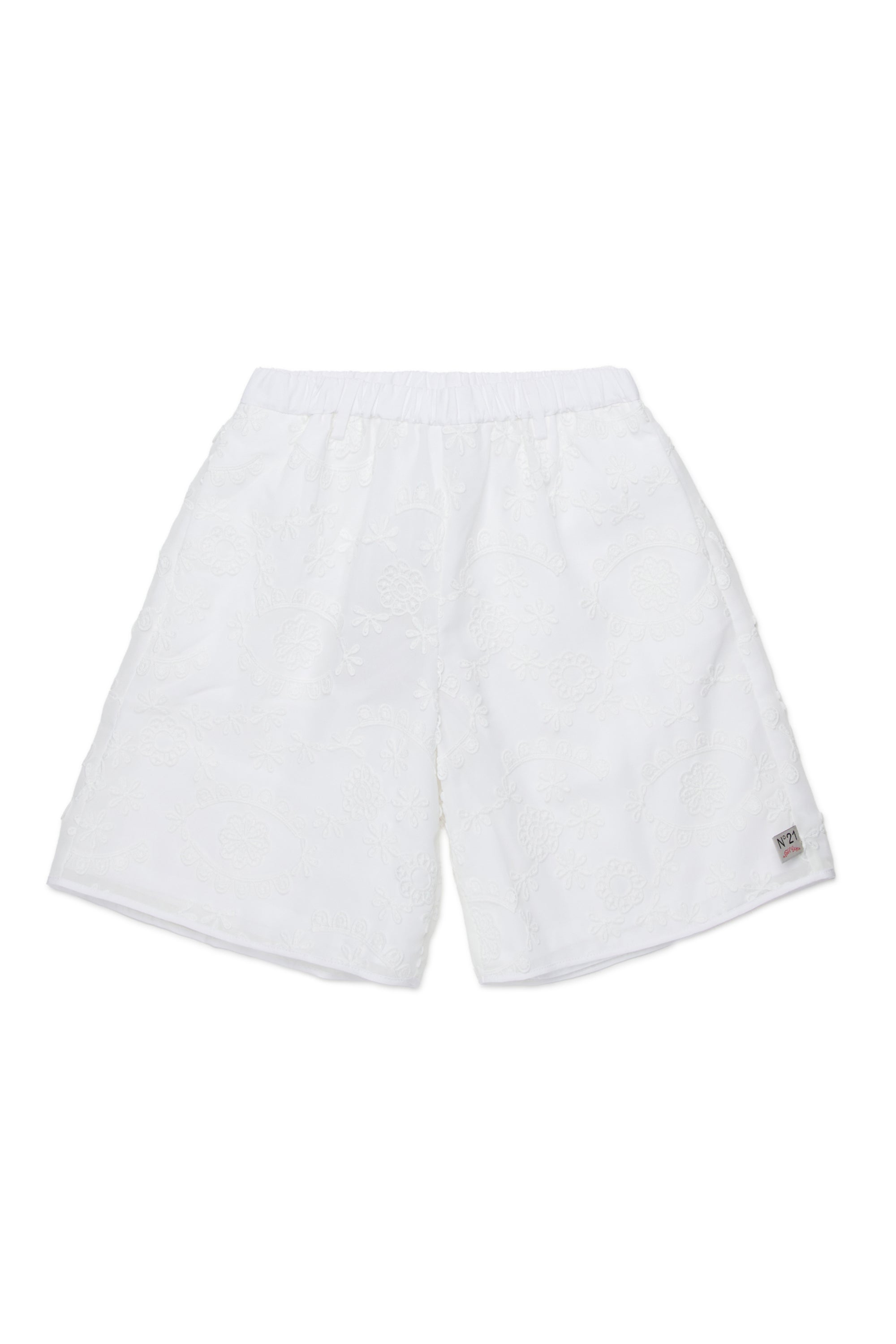 White fabric shorts with an embroidered floral motif. Elastic waistband for a comfortable fit. The fabric features embroidery along the surface and clean stitching. A simple hem and straight fit complete the piece.