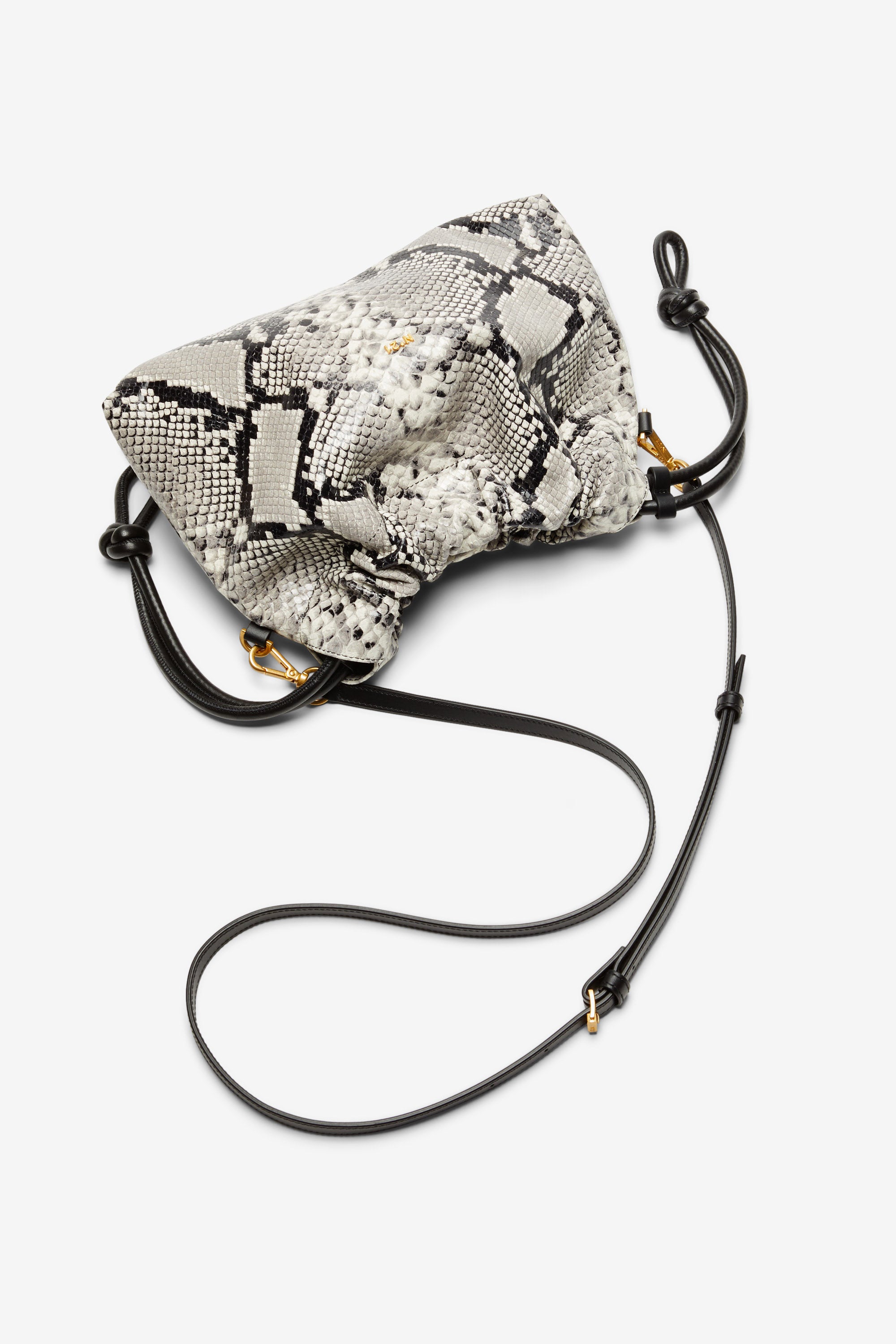 Python-effect shoulder bag in gray tones. It has a soft, pouch-like shape with gathered edges. It features a gathered top opening and gold-tone hardware. The adjustable shoulder strap is attached to the body of the bag with gold-tone hardware.