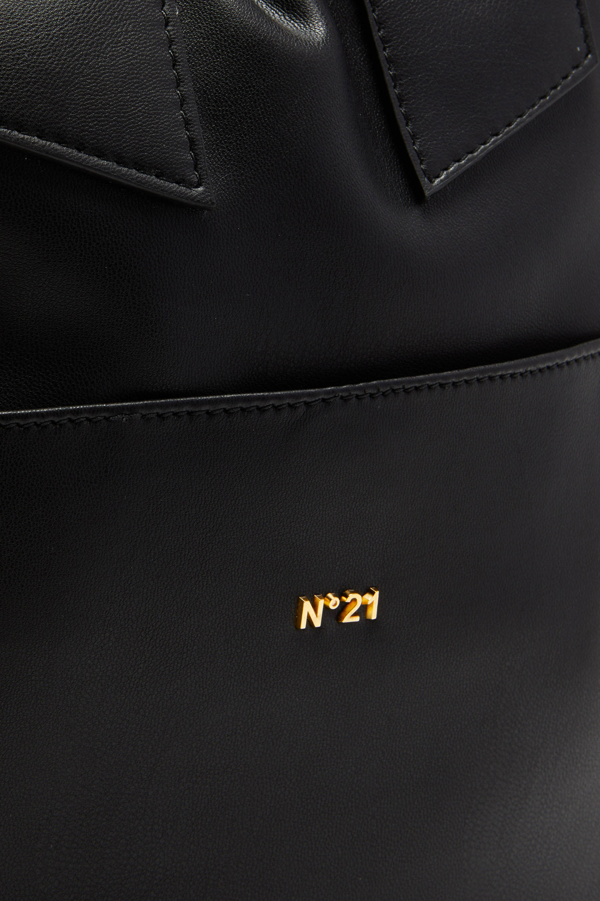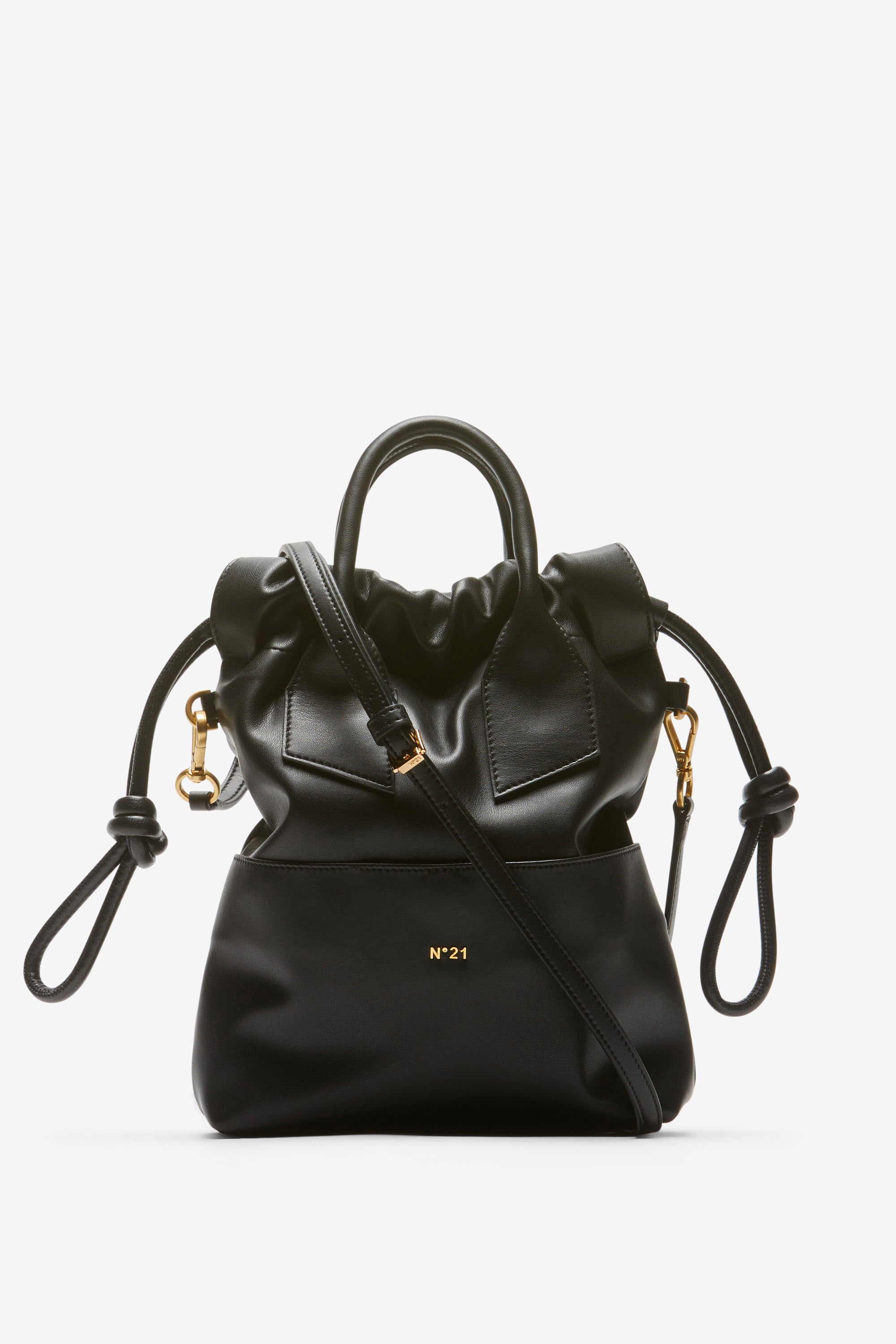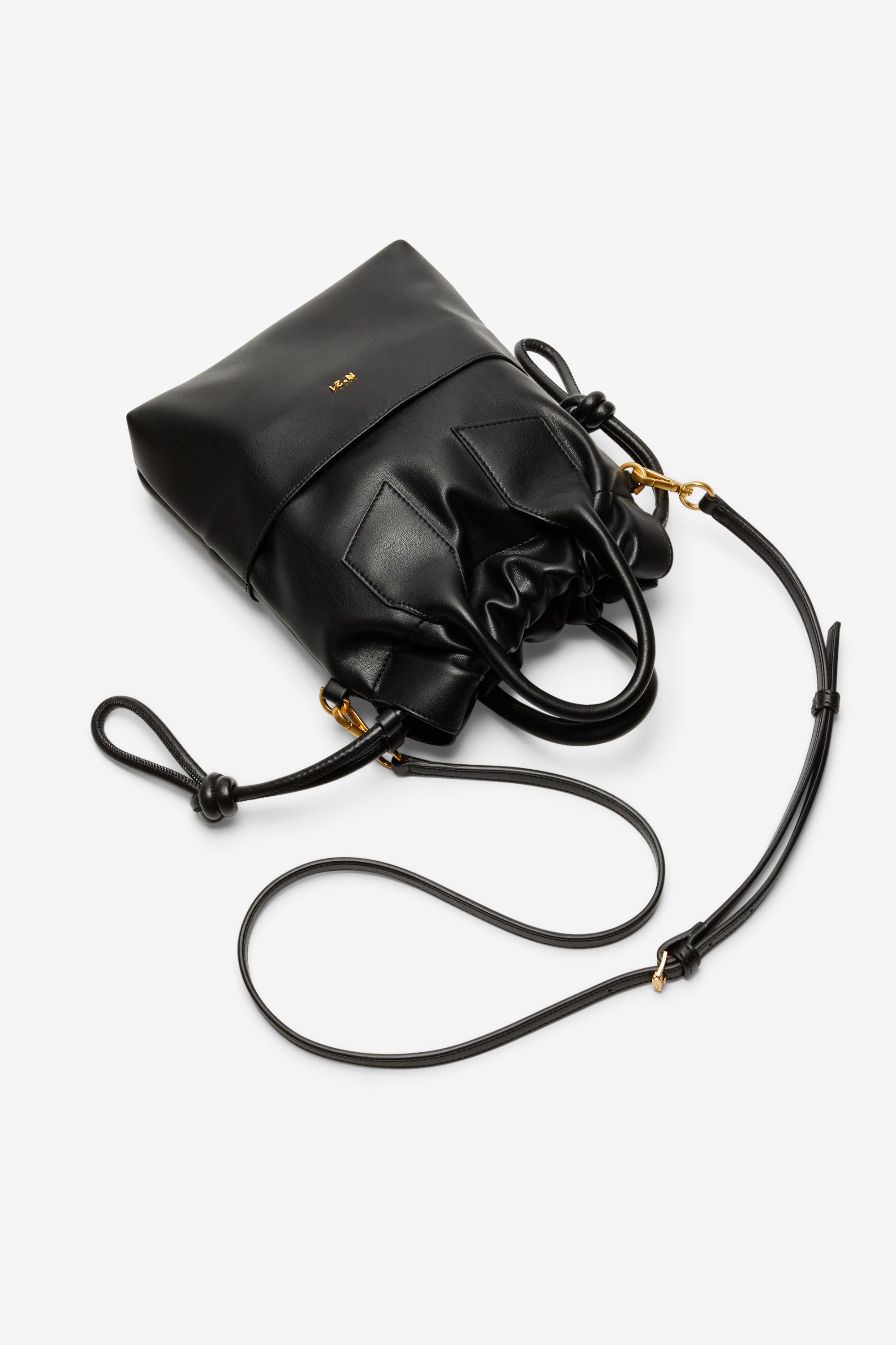 Black faux leather shoulder bag. The drawstring top closure creates a gathered effect and a soft shape. It features a short handle for carrying by hand and an adjustable, removable shoulder strap for carrying over the shoulder or cross-body. Gold-tone hardware completes the finish.