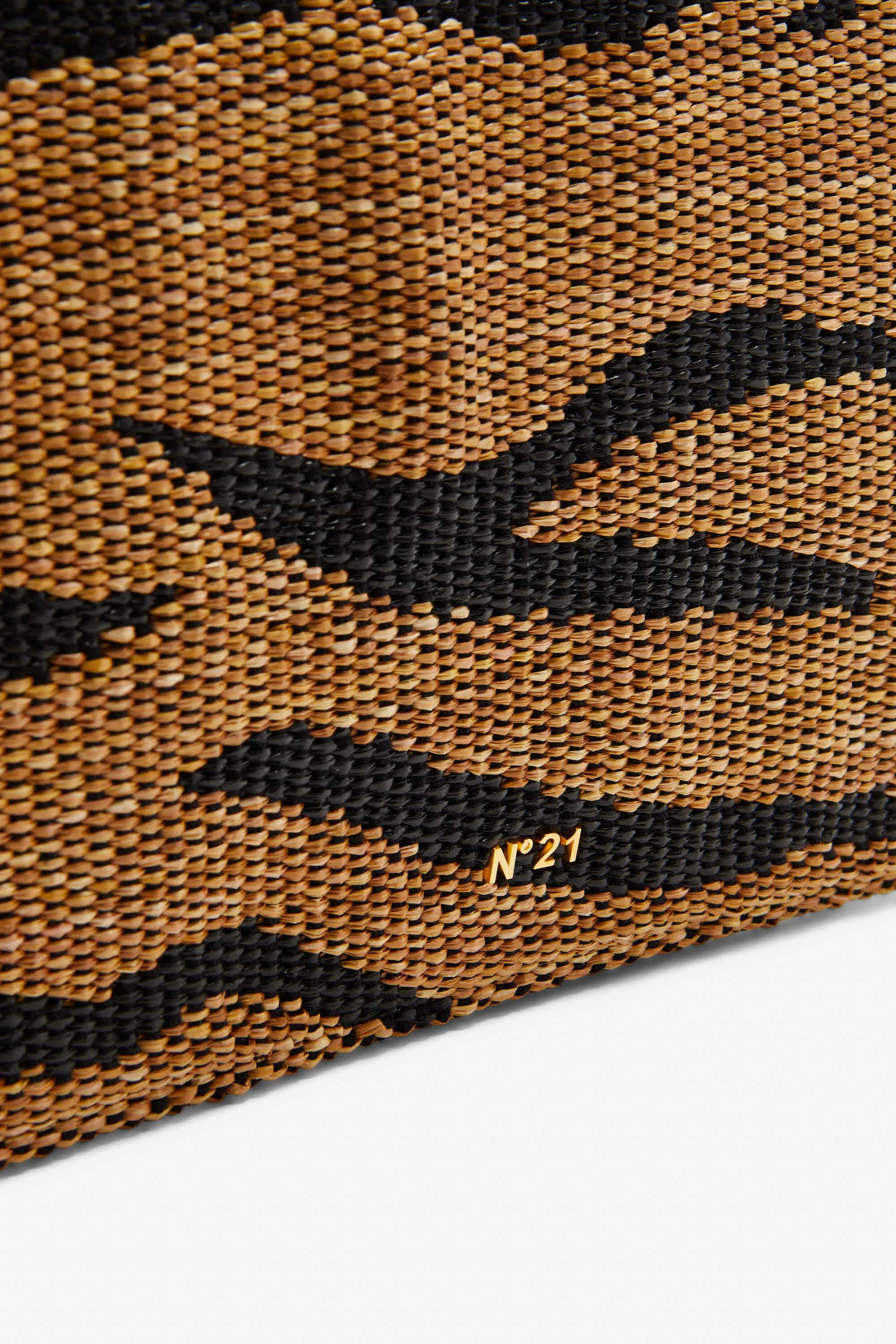 Flat clutch bag made of woven fabric with a brown and black tiger print. Rectangular and flat, it's compact enough to hold your essentials. It closes with a zip at the top, and the black leather shoulder strap is attached with gold hooks.