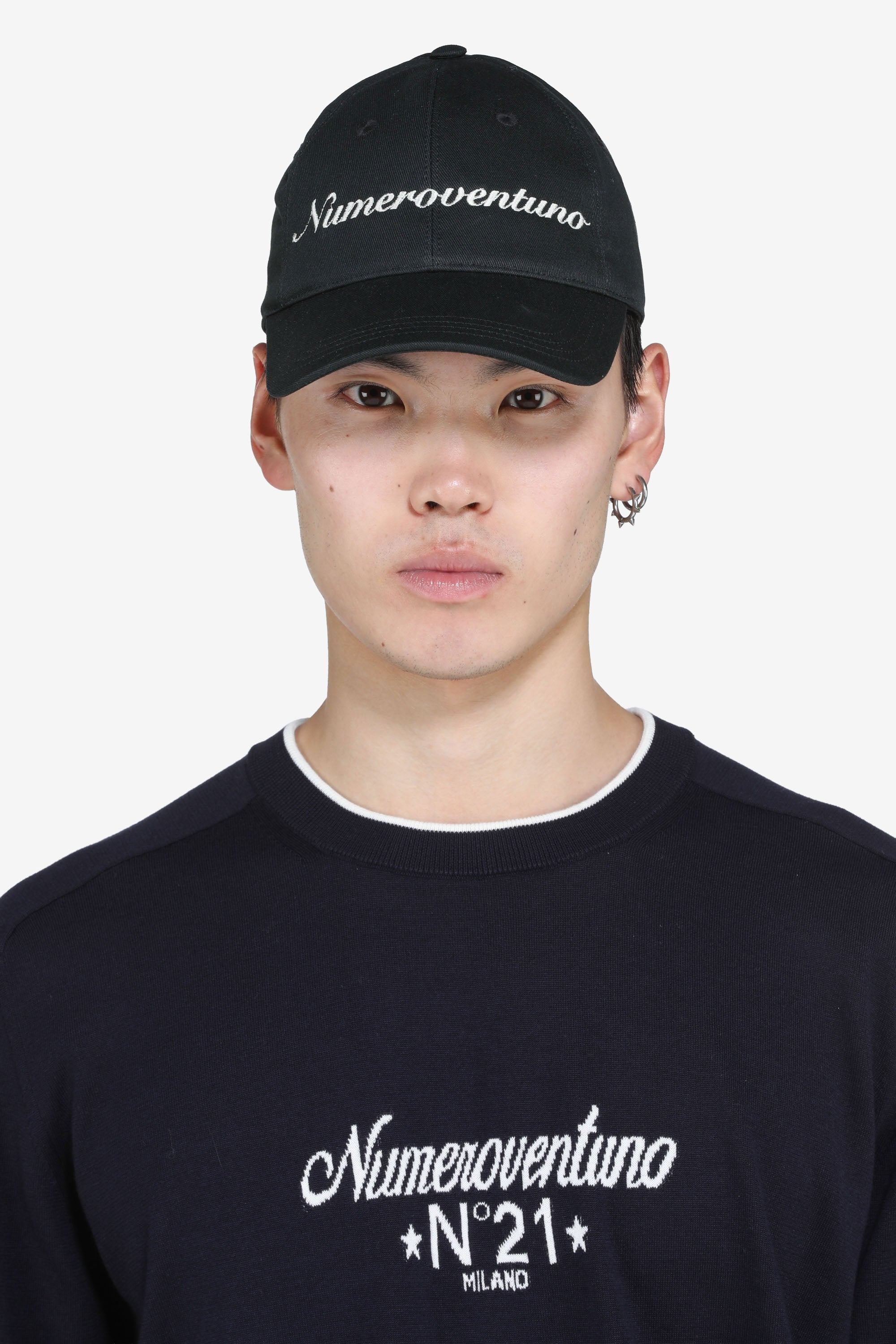 Six-panel baseball cap with a curved brim, black. The front features white embroidery contrasting with the white "Numeroventuno" lettering. The paneled construction is finished with visible stitching.