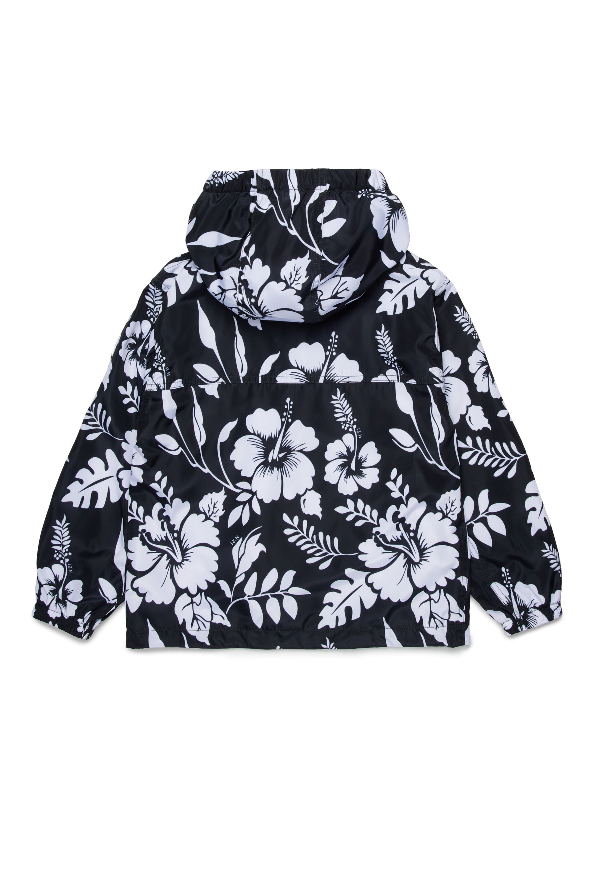 Lightweight synthetic hooded jacket. White floral print on a dark background. Full zip front and side zip pockets. Straight fit.