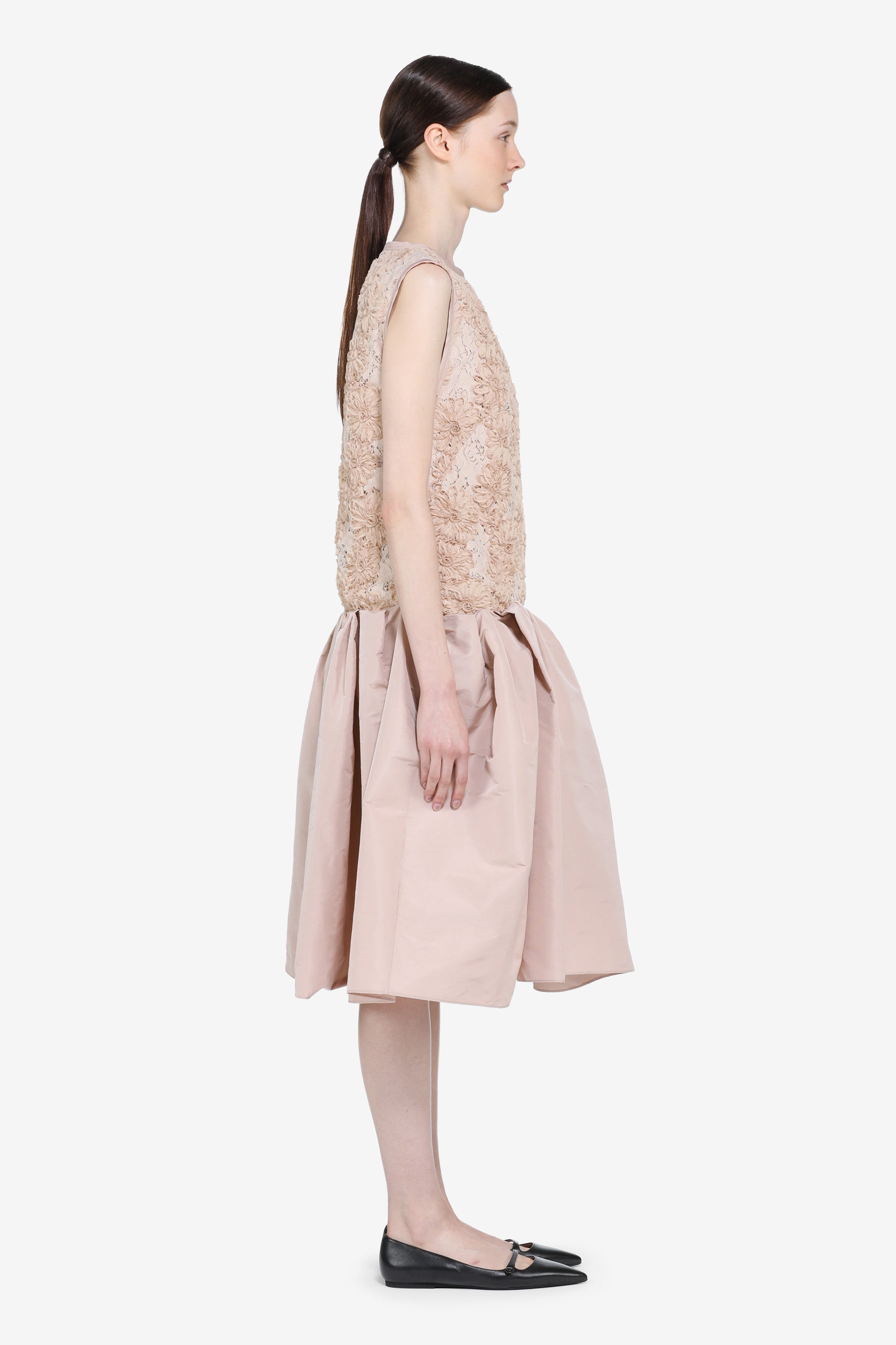Sleeveless knee-length dress with a floral lace bodice and matching lining. The full, structured skirt is crafted from a light pink sheen with pleats that define the silhouette. The color is blush pink and the length reaches the knee. The piece features a defined waistline and neat finishes for a clean finish.