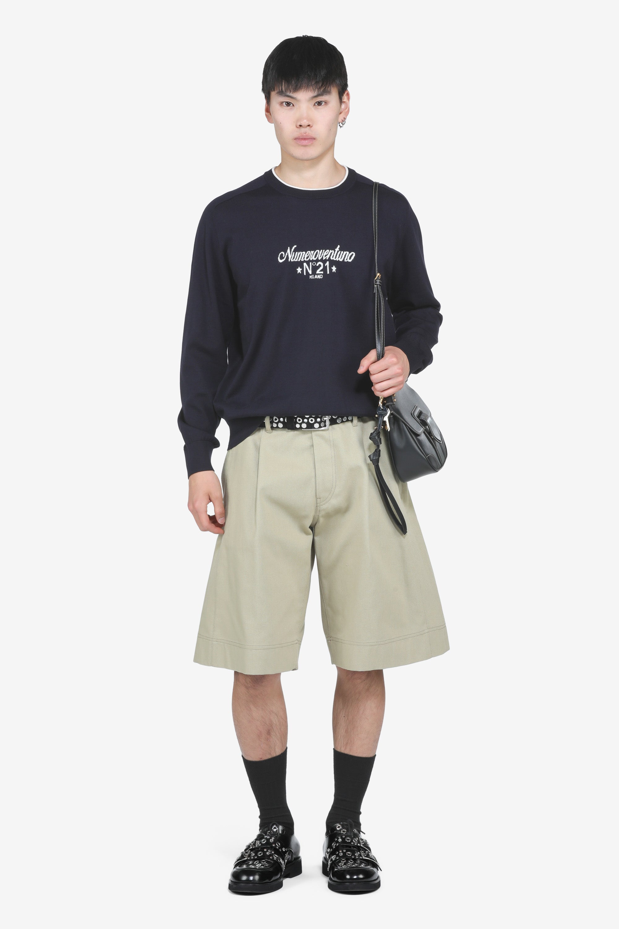 Crew neck, long-sleeved sweater in navy blue. Made of knit fabric with ribbed edges at the neck, cuffs, and hem. Features a white graphic on the front. Regular fit.