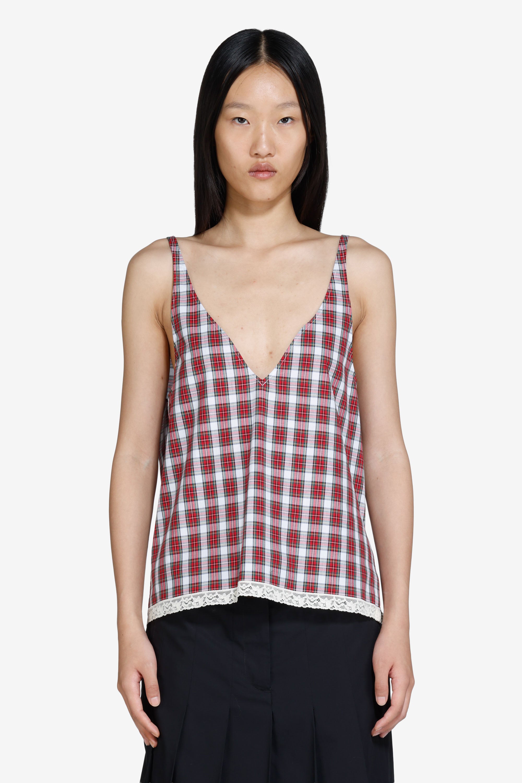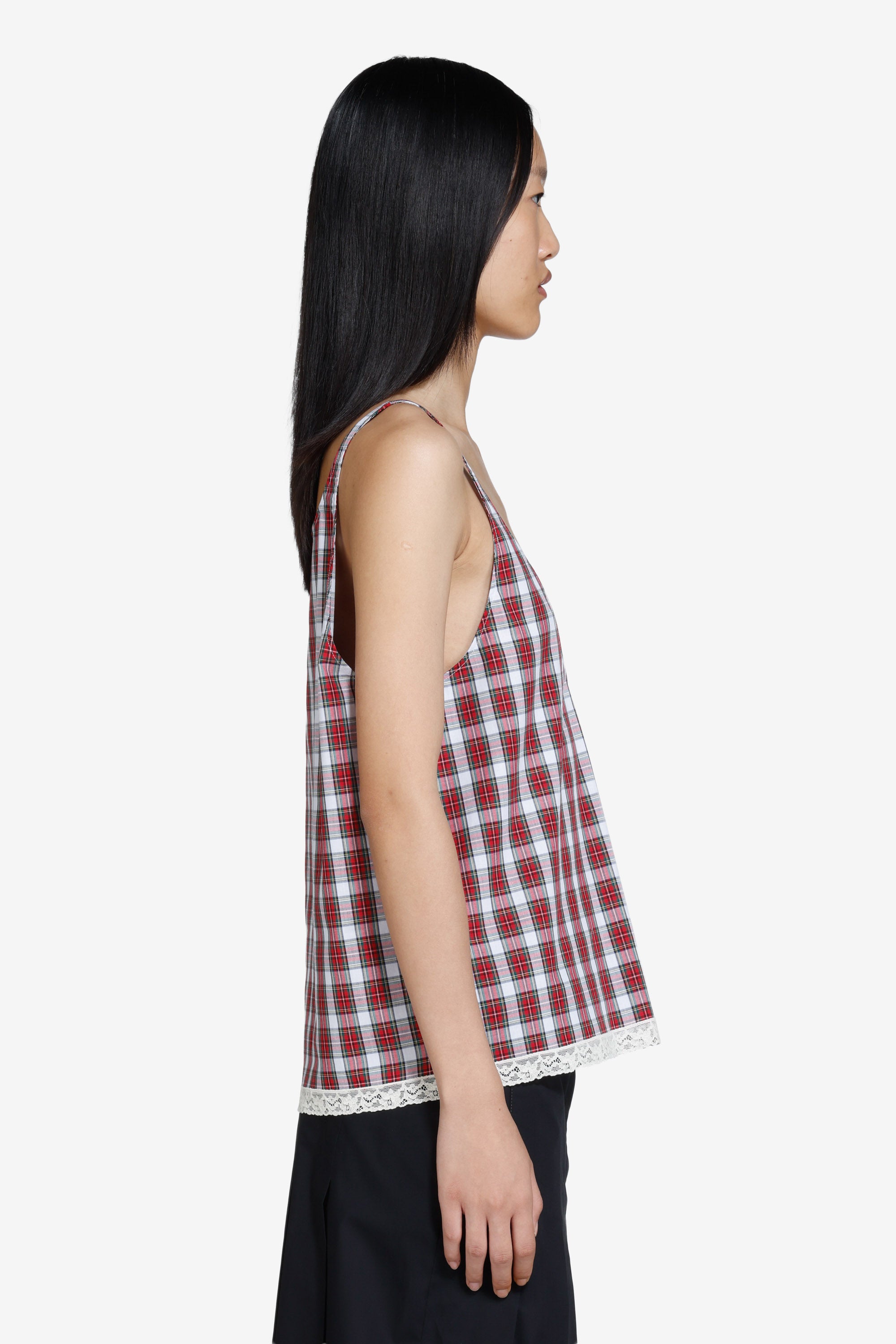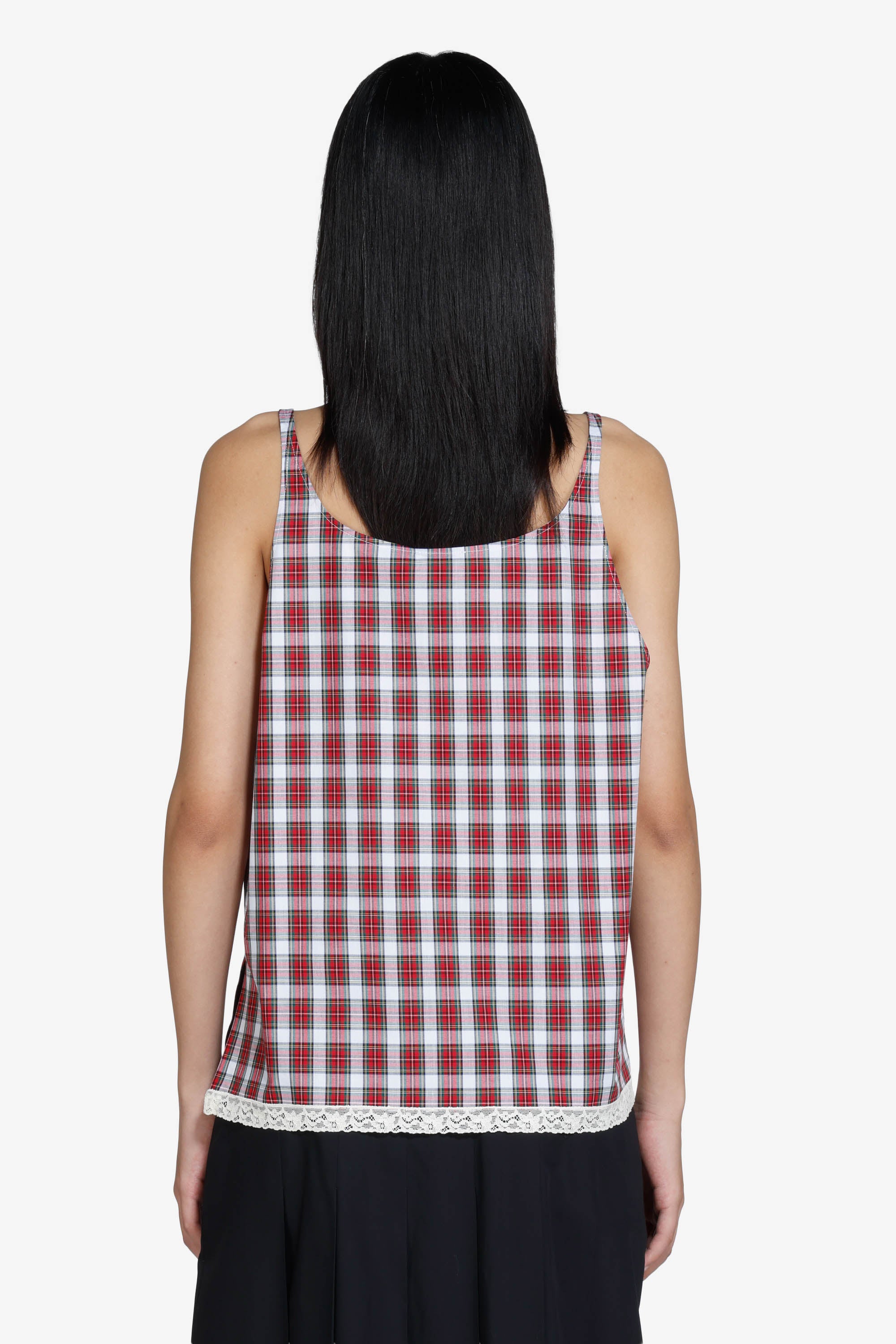 Low-cut checked tank top with thin straps and a deep V-neck. The red and white checked pattern lends a casual, summery look. The bottom hem is trimmed with white lace, adding a visible construction detail. The relaxed fit falls flat on the figure without constriction.