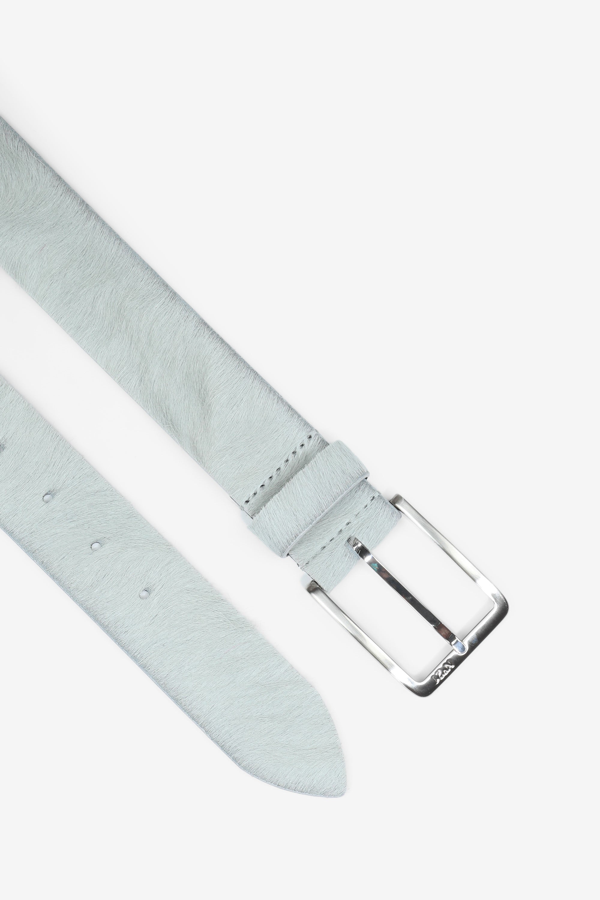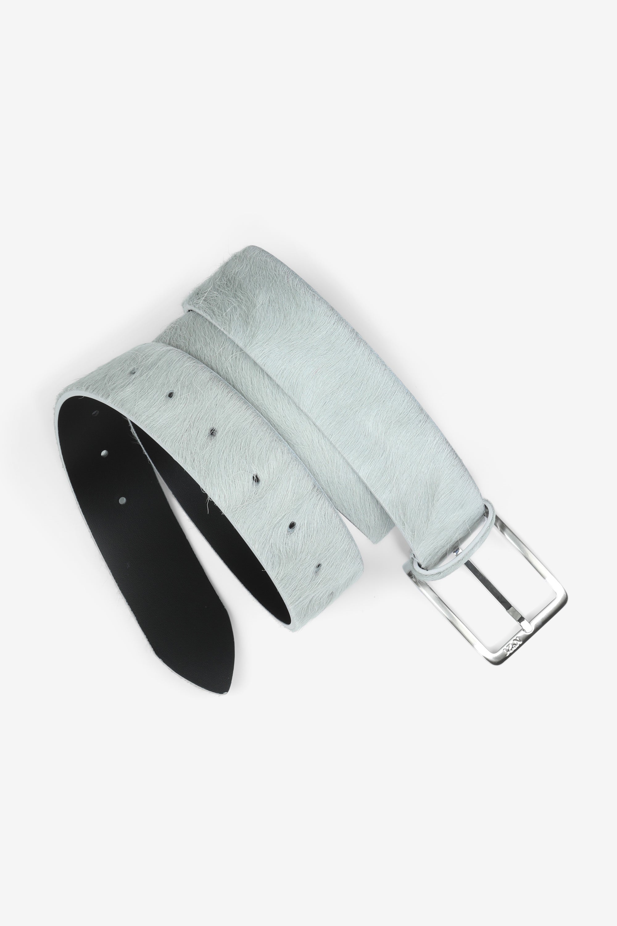 Belt made with a light gray ponyskin surface. The product has a black leather back and finished edges. It closes with a silver-tone metal buckle and holes. Clean construction.