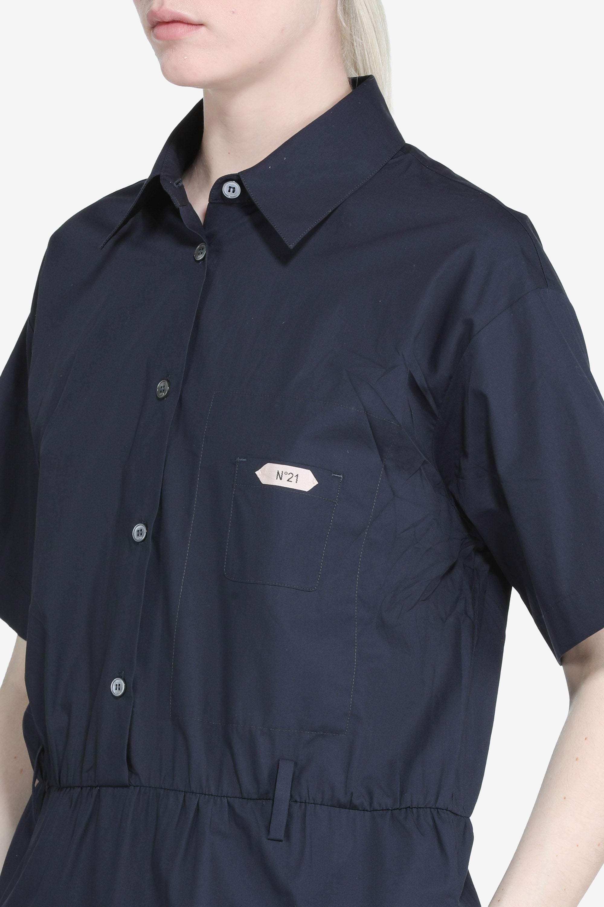 Navy blue shirt dress with a classic collar and short sleeves. It has a button-up front and a shirtdress style. An elastic waistband defines the silhouette, and the hem is finished with a ruffle. It reaches the knee.