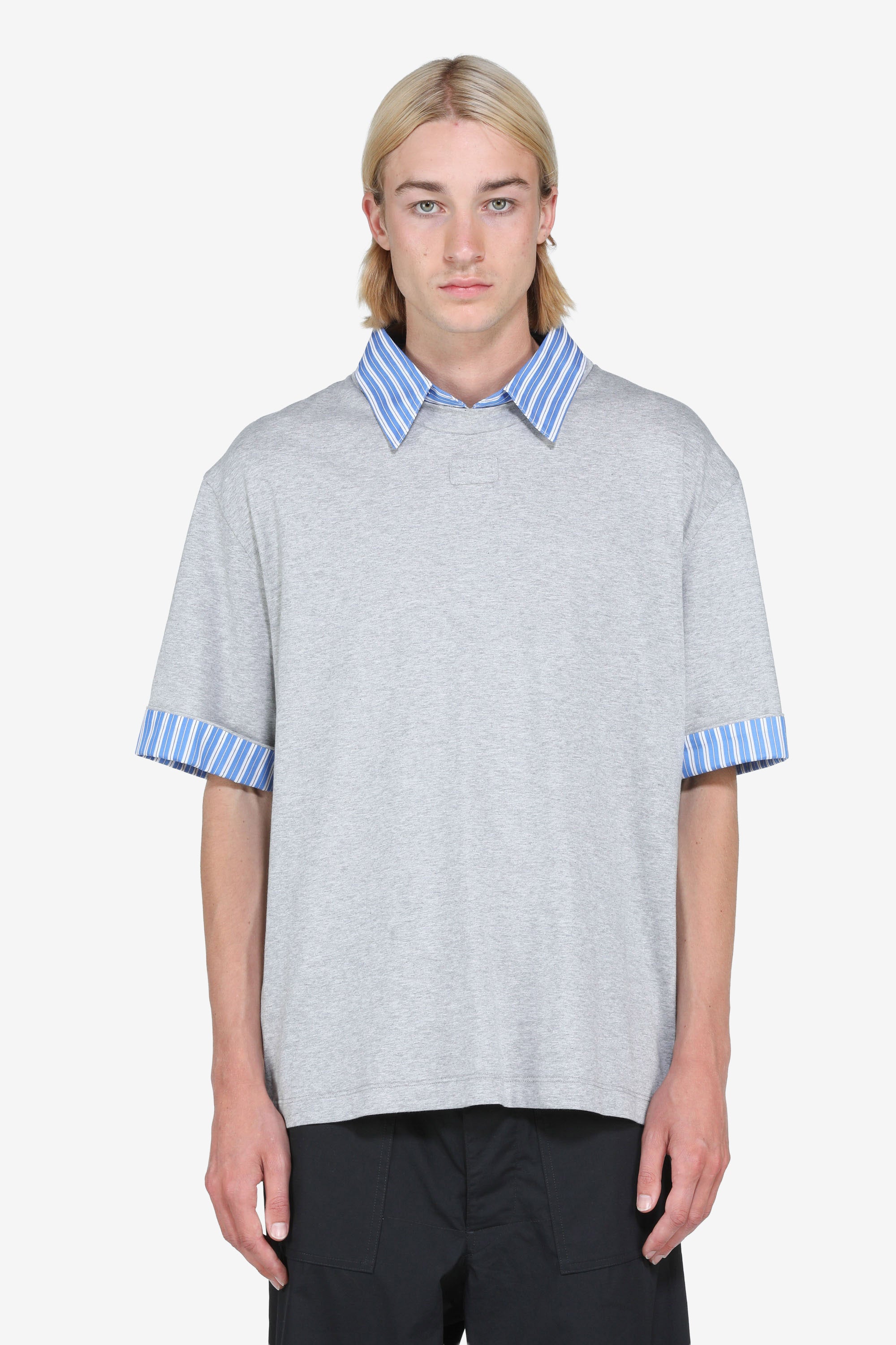 Short-sleeved T-shirt with a shirt collar, made of light gray jersey fabric. The collar and cuffs feature a blue and white striped pattern. The loose fit is straight and features minimal stitching. The design is understated, devoid of decorative details.