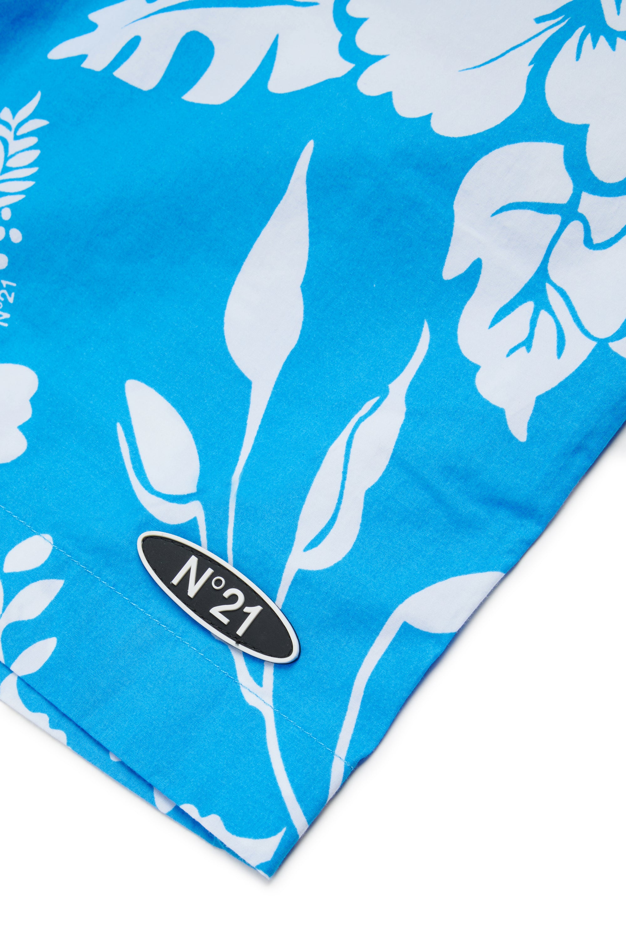 Lightweight shorts with an elastic waist and front button closure. Light blue with a white floral print. Regular fit and short length. Simple stitching and a clean finish.