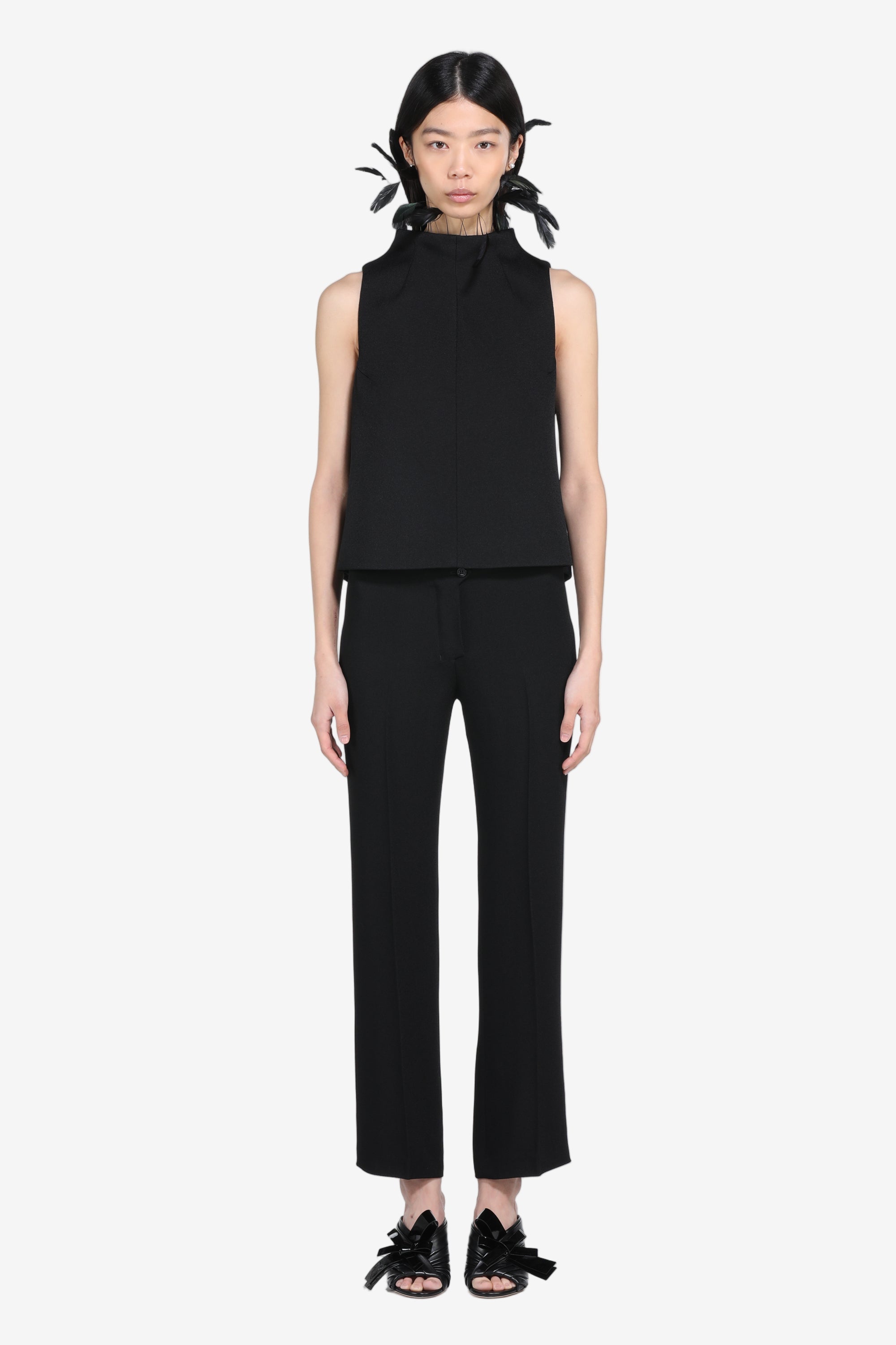 Sleeveless top made of high-quality fabric. The black piece has a relaxed fit. The elegant design features feather details on the collar and a zip closure at the back. This top is ideal for a sophisticated look suitable for a variety of occasions.