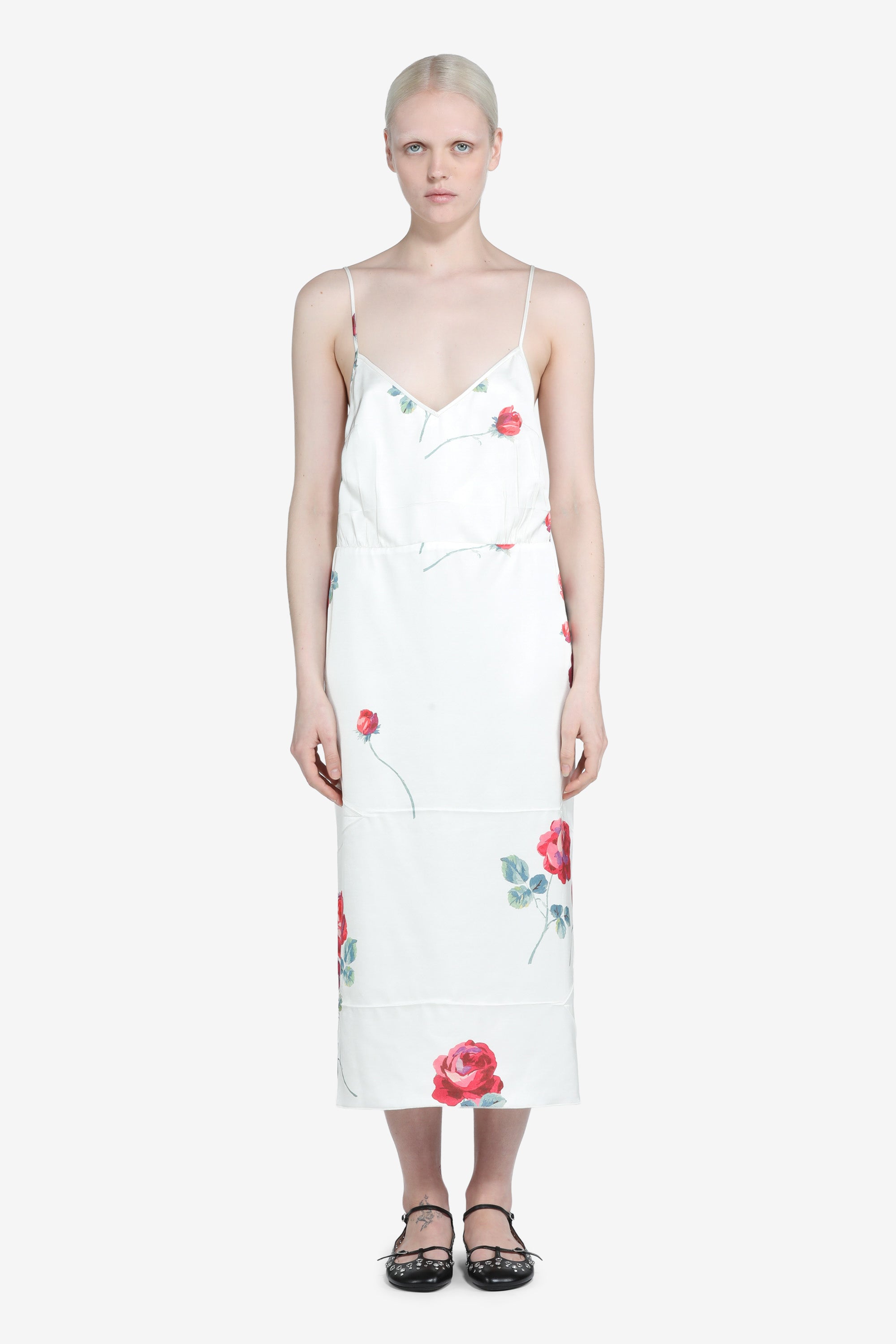 Long dress with thin straps and a V-neck. The lightweight, shiny fabric features a floral print on a light background. The ankle-length dress features a seam along the bust line at the waist. Red roses and green leaves appear throughout the floral pattern.