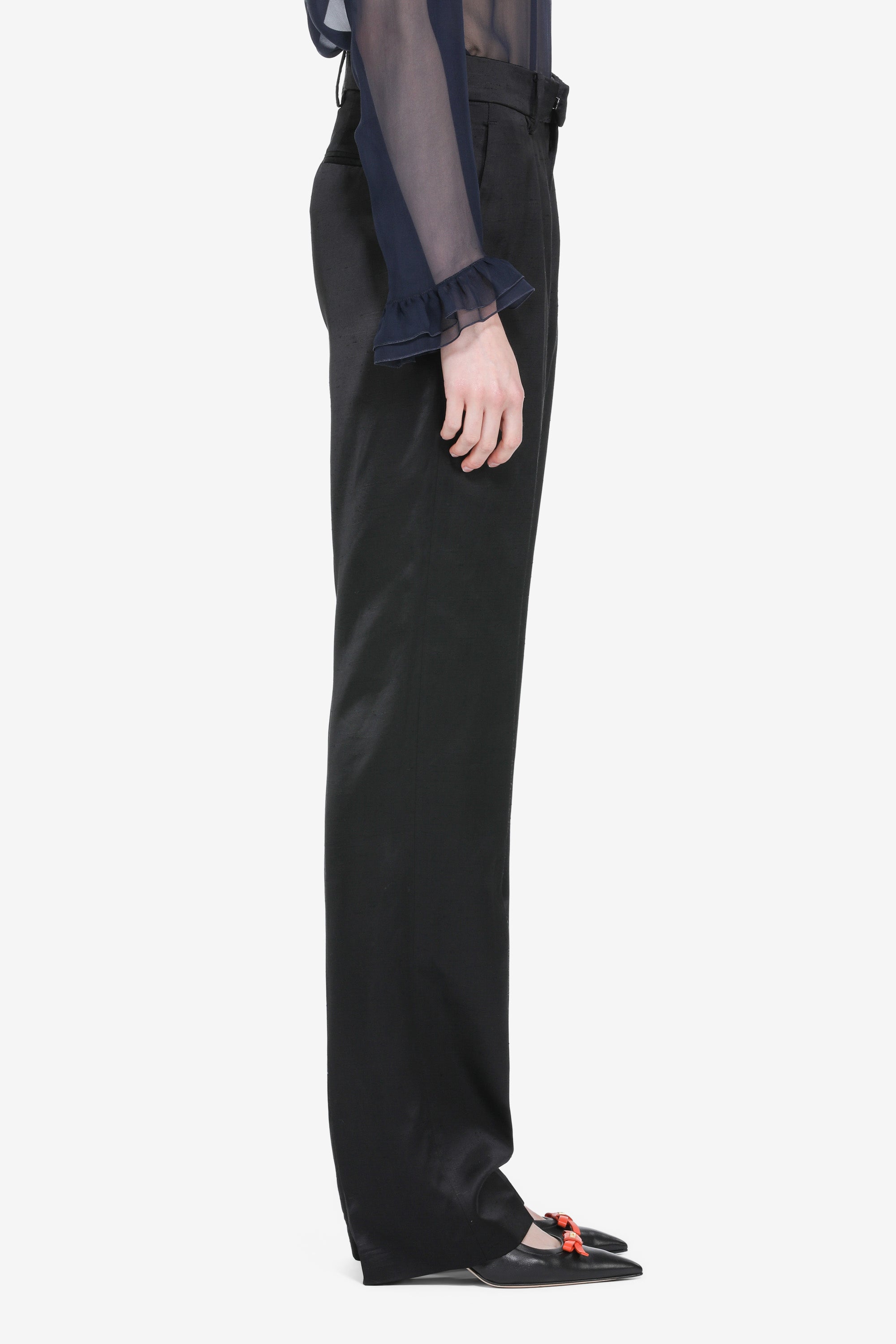Straight-leg trousers in black shantung. The satin fabric offers a delicate sheen and a smooth fit. The construction includes a belt with belt loops. The straight cut defines a clean silhouette.