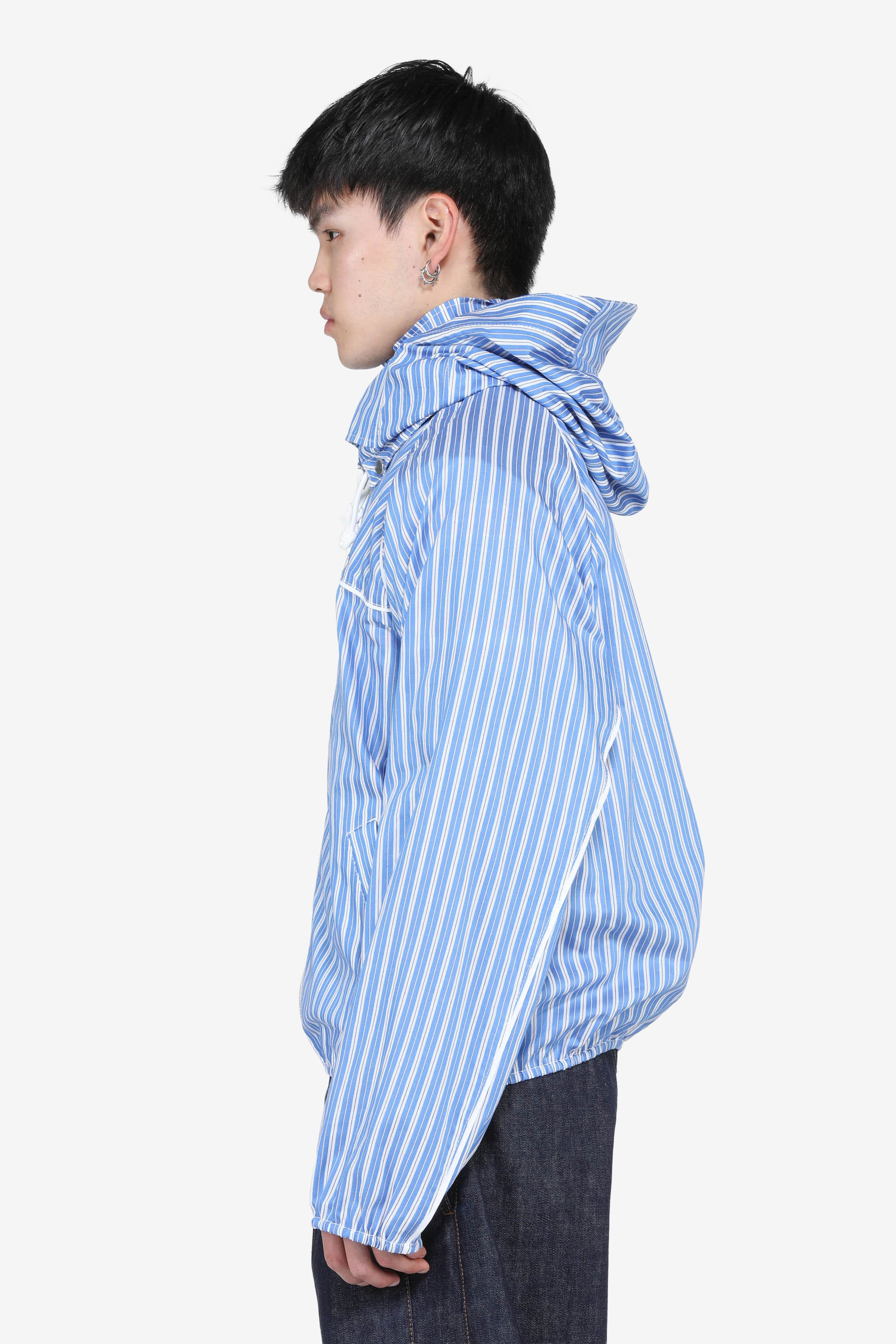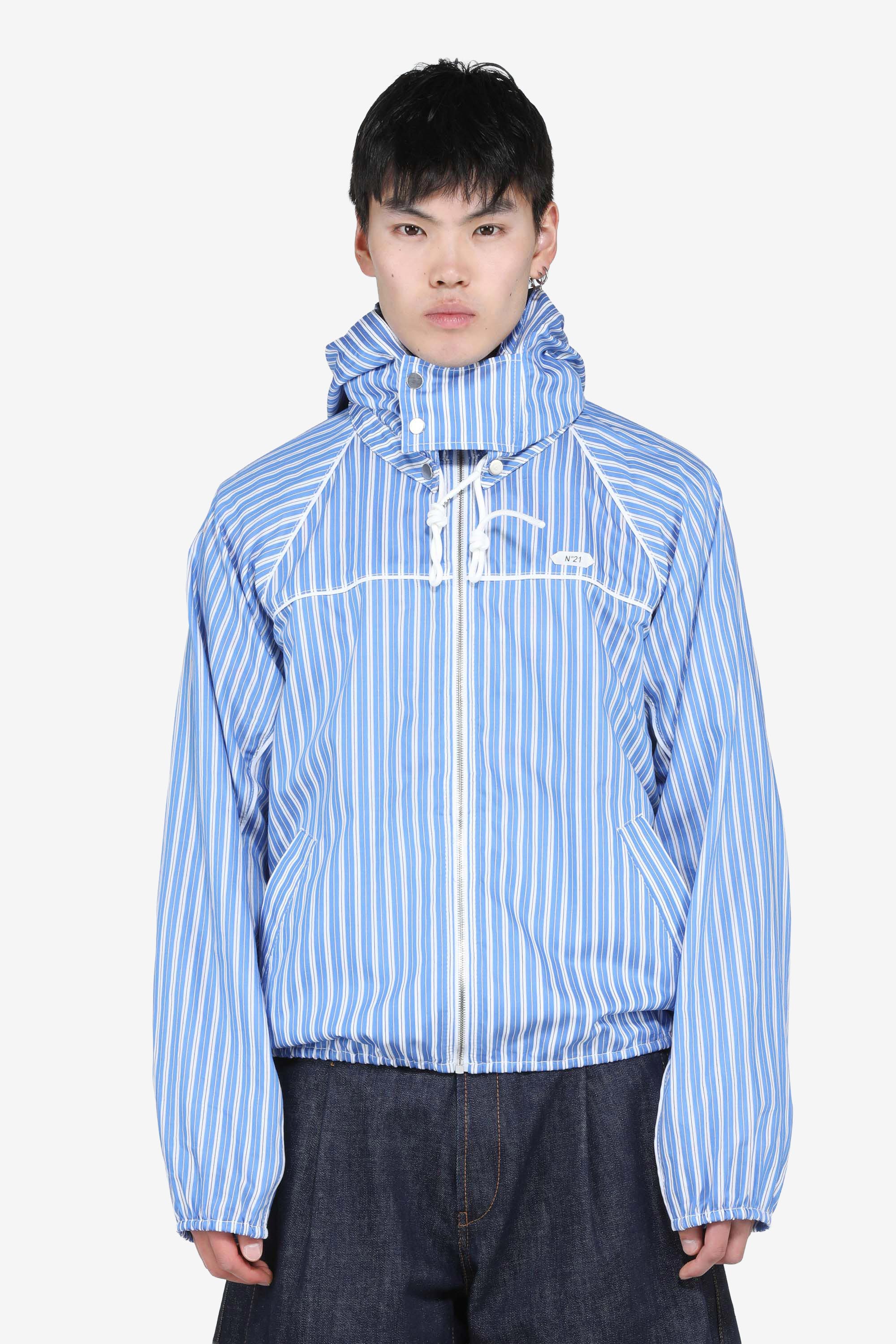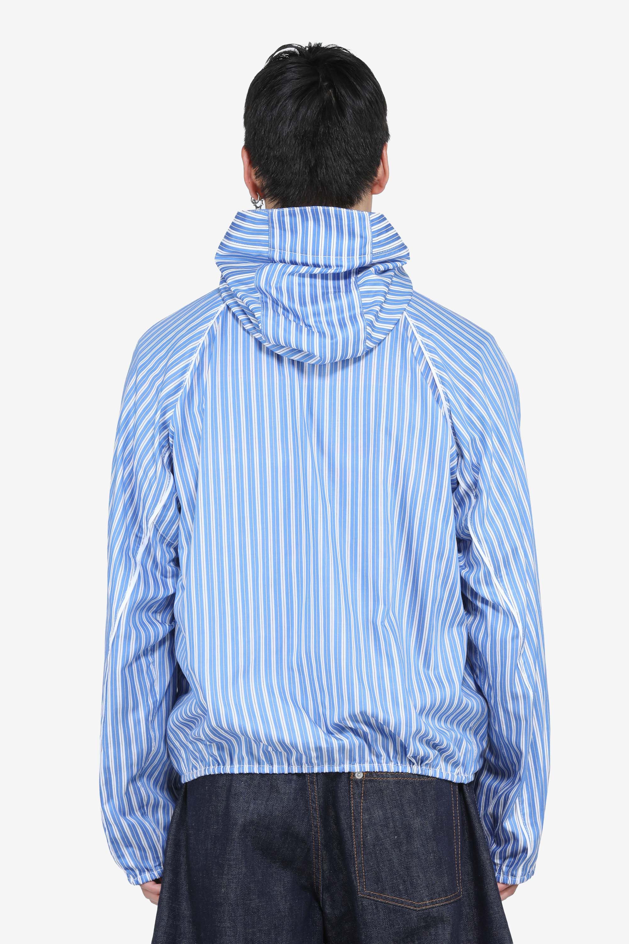 Lightweight striped hooded jacket. Zip front closure with adjustable drawstrings on the hood. Lightweight fabric with a relaxed fit and front pockets. Small logo on the chest. Light blue and white striped design with visible stitching throughout.