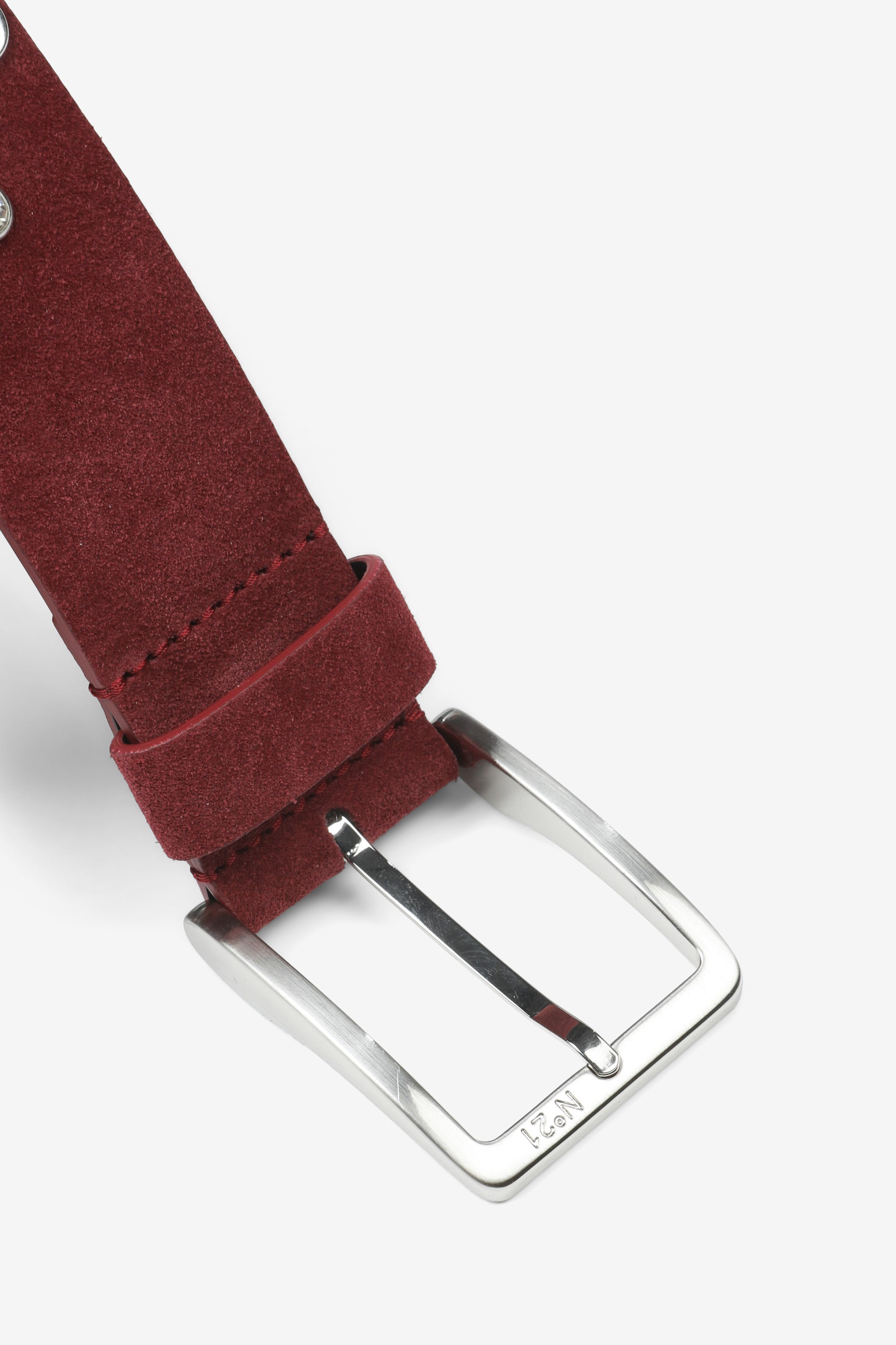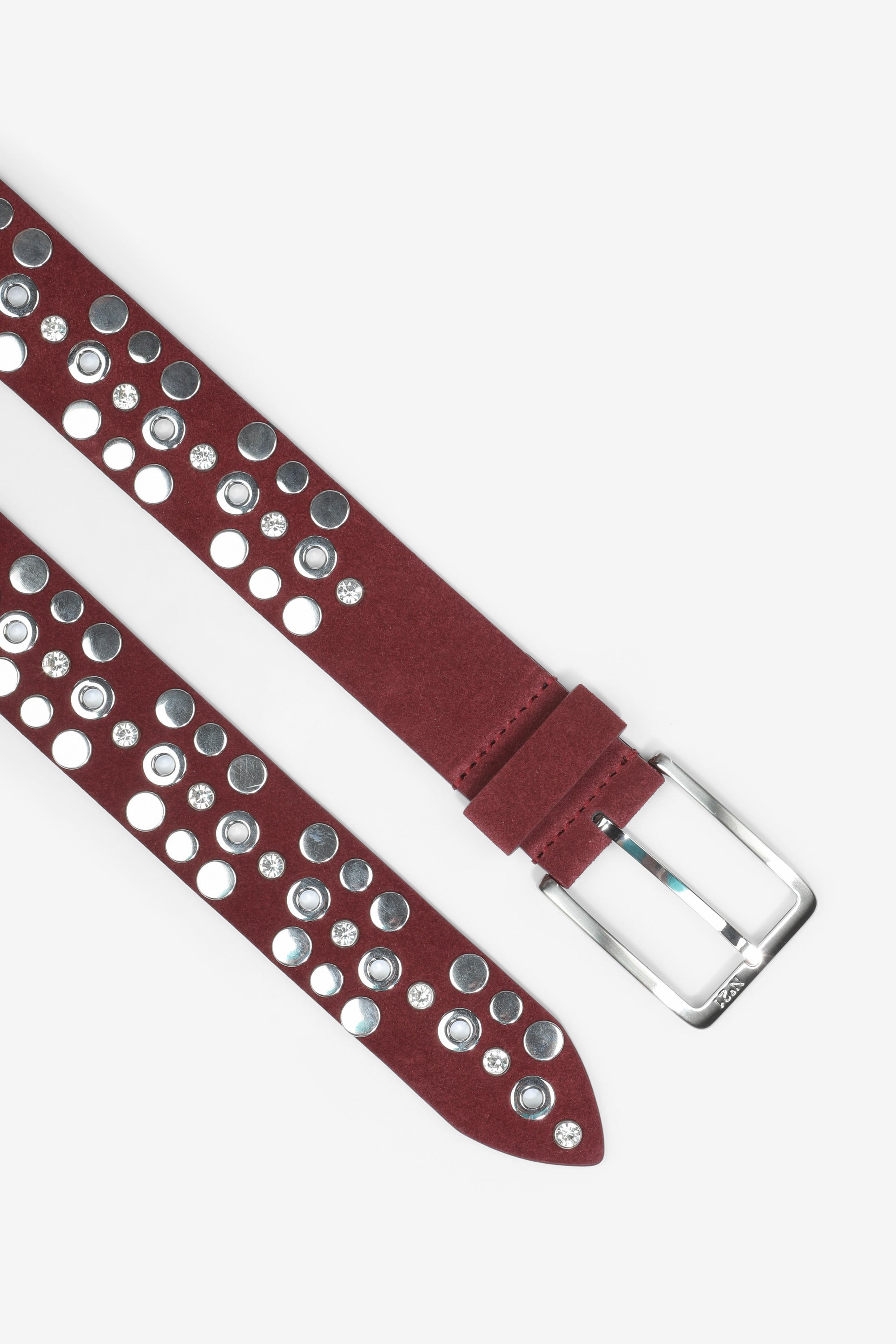 Suede belt with studs. The burgundy strap features round metal studs of various sizes along the surface, with a black interior. It closes with a silver-tone metal buckle.