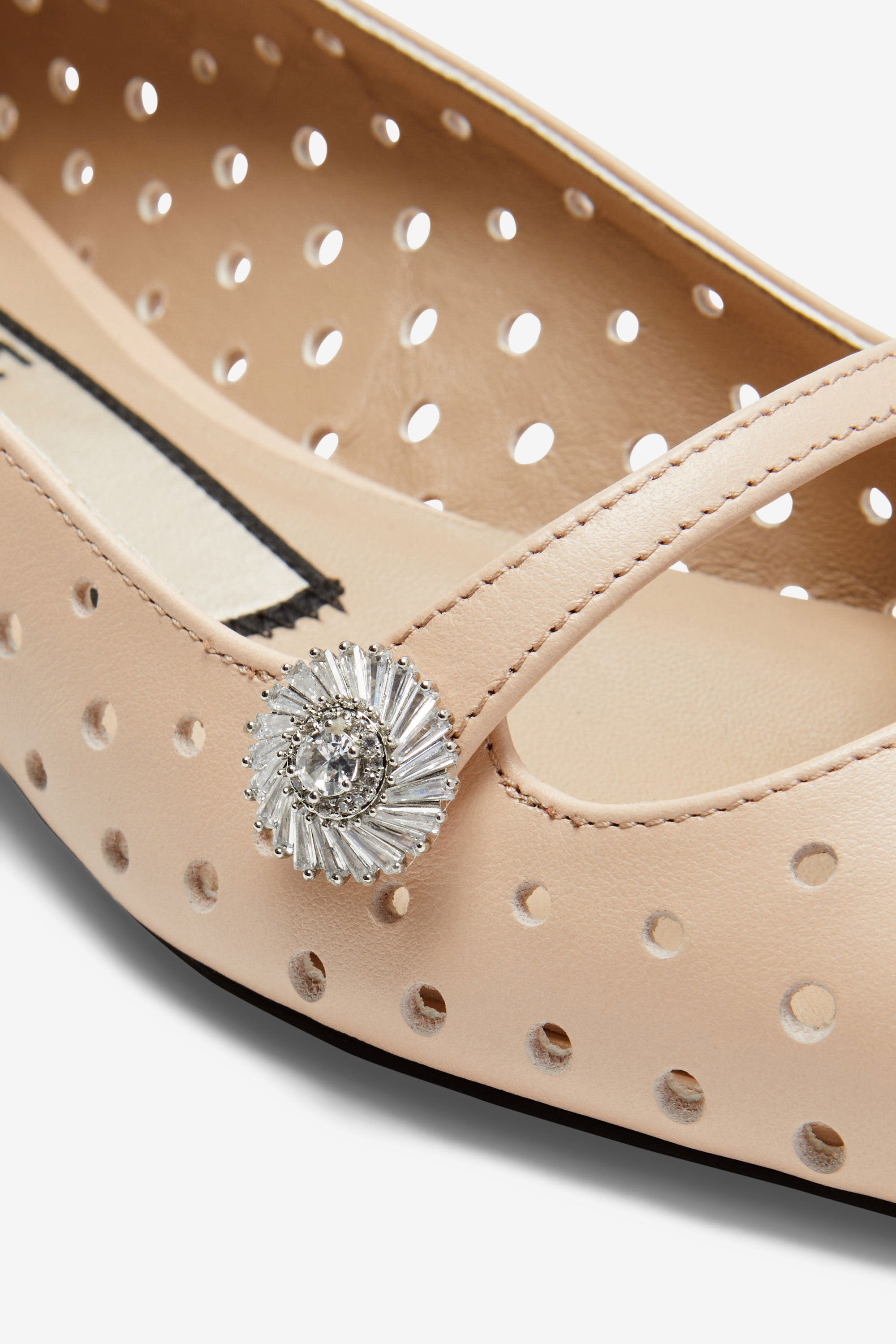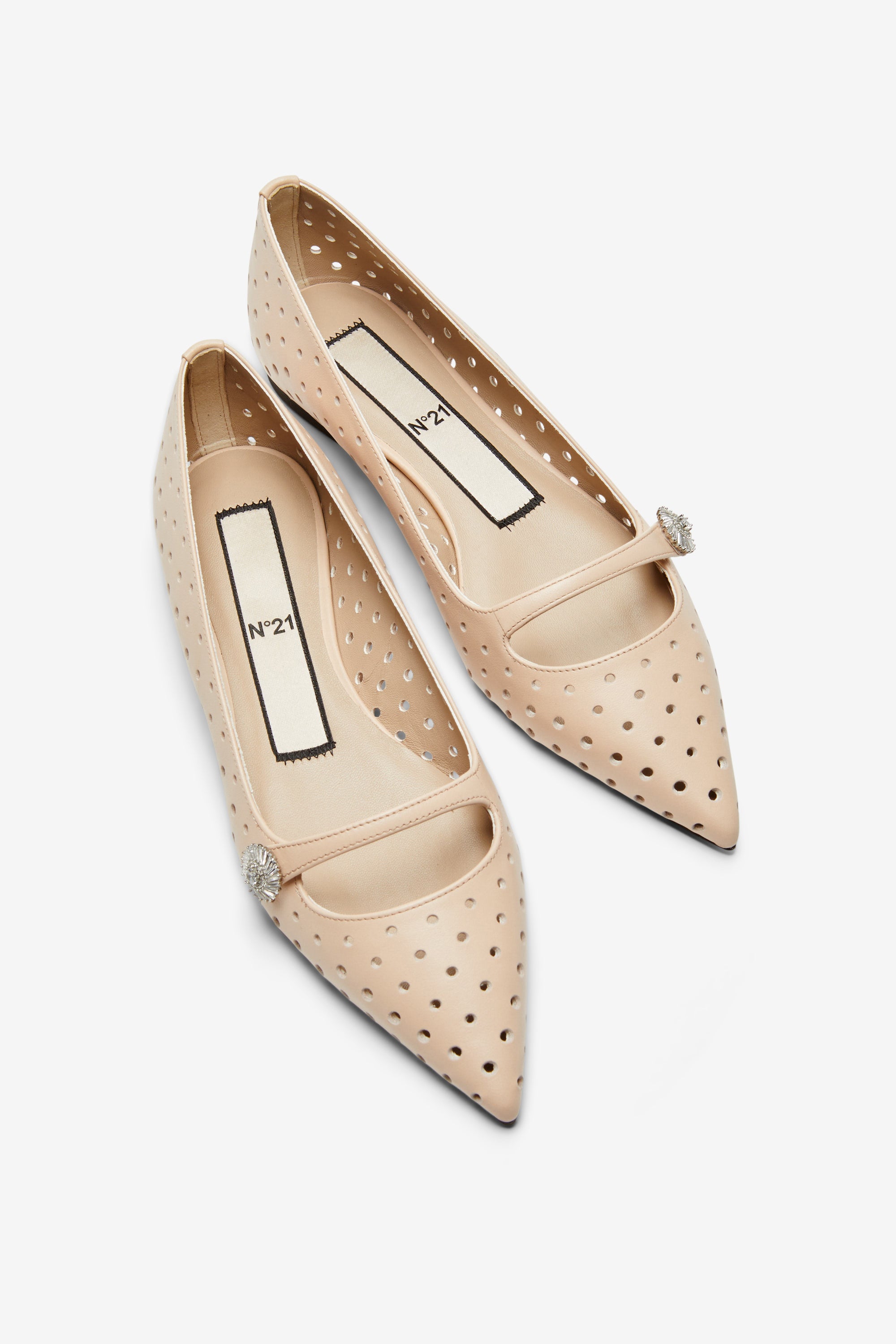 Ballerine a punta in pelle traforata di colore beige chiaro. La tomaia presenta fori regolari. La suola è sottile e la forma è aderente al piede. Un dettaglio decorativo a gioiello si trova sulla fascia frontale.