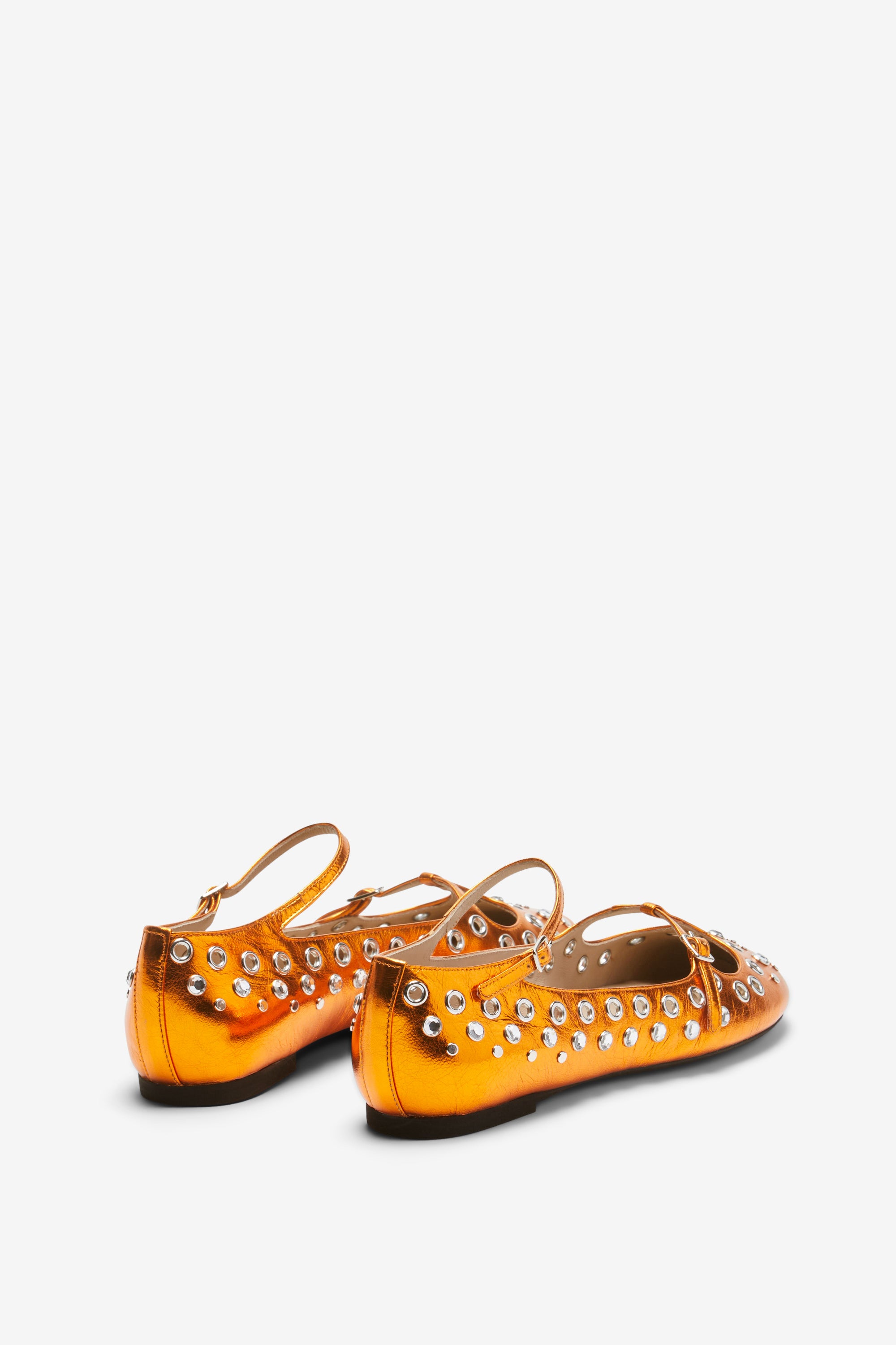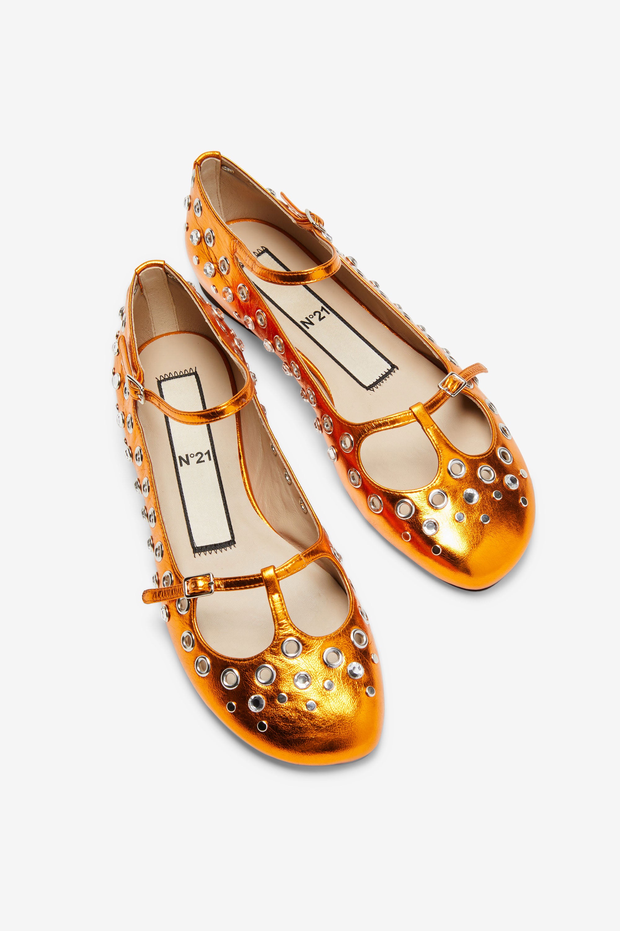 Ballerina con punta tonda realizzata in pelle lucida metallica arancione dorato. La tomaia è decorata da borchie rotonde argentate distribuite su tutta la superficie. Chiusura a cinturino sottile con fibbia regolabile. Suola bassa e piatta, costruzione semplice.