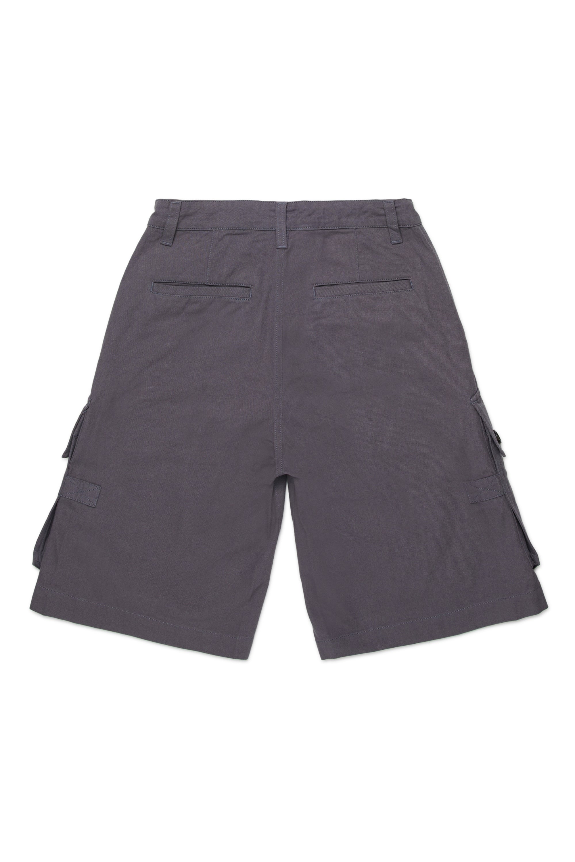 Bermuda cargo in cotone resistente con lunghezza media. Colore grigio viola. Taglio regolare con cintura e passanti, chiusura frontale a bottone. Tasche cargo laterali con pattina e bottone, e una patch applicata sul fondo della gamba.