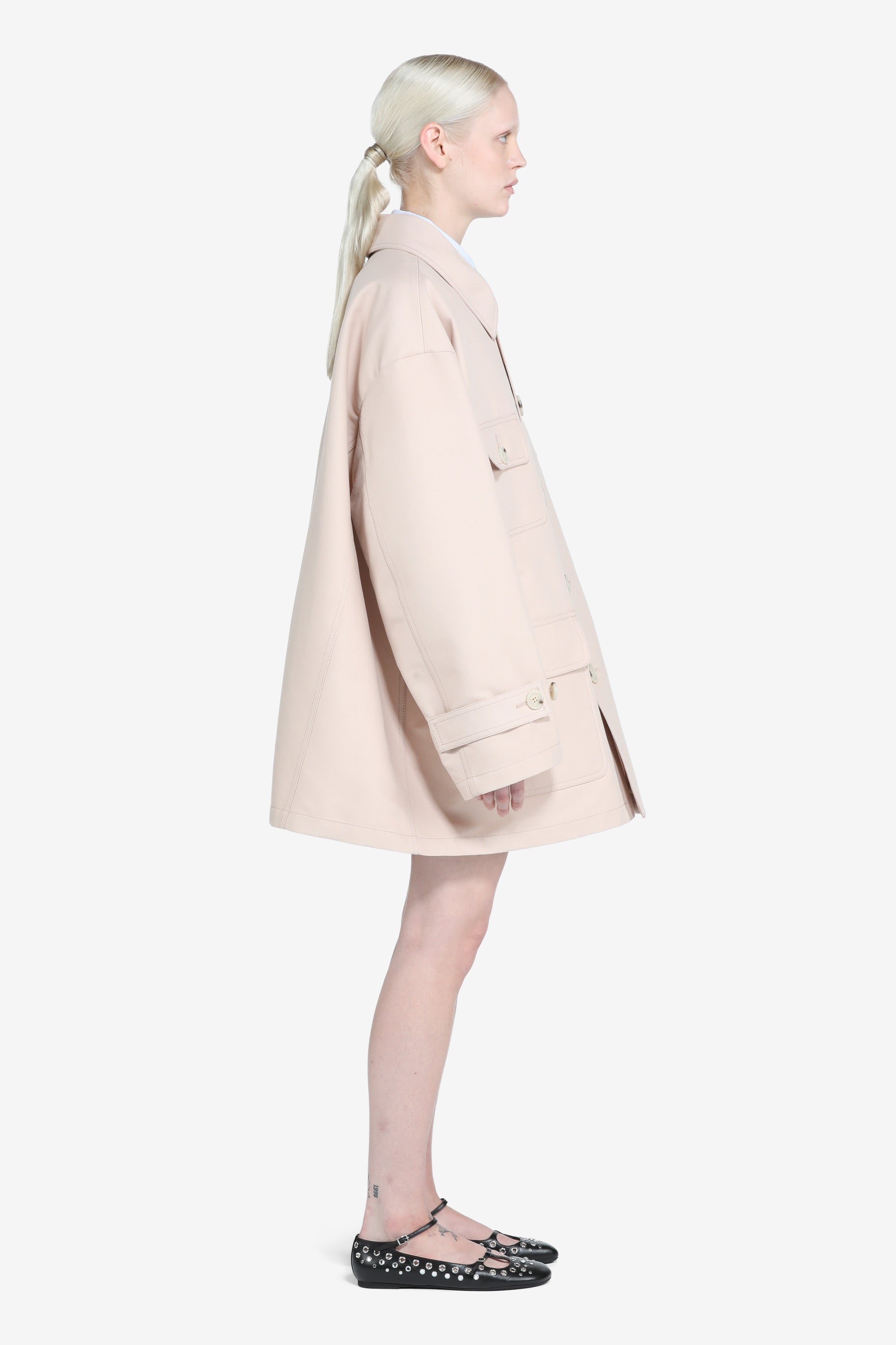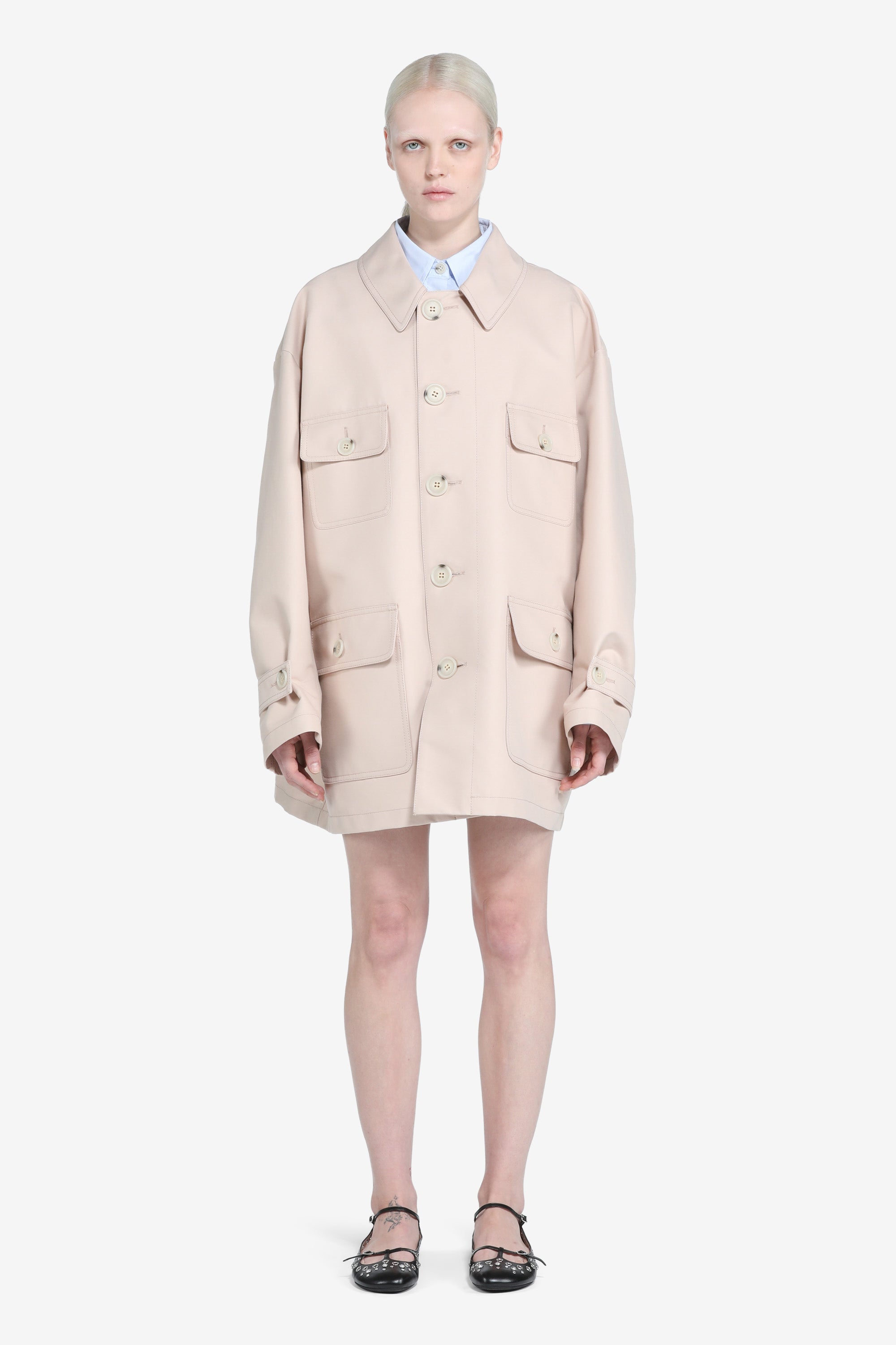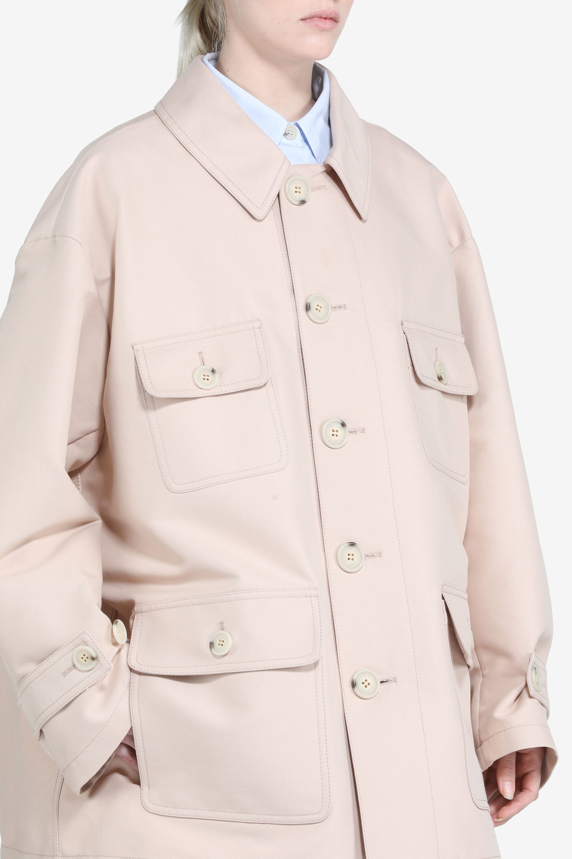 Caban beige chiaro con tasche frontali a pattina. Taglio oversize con maniche lunghe e collo classico. Chiusura frontale a bottoni e cuciture visibili sui bordi. Lunghezza che arriva a metà coscia.
