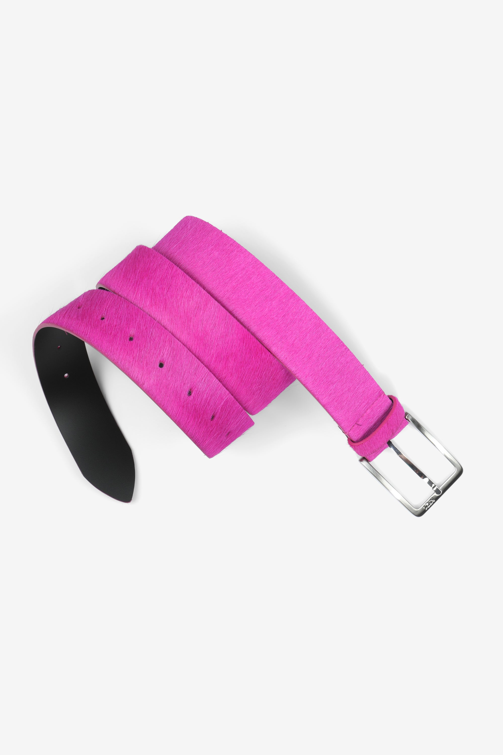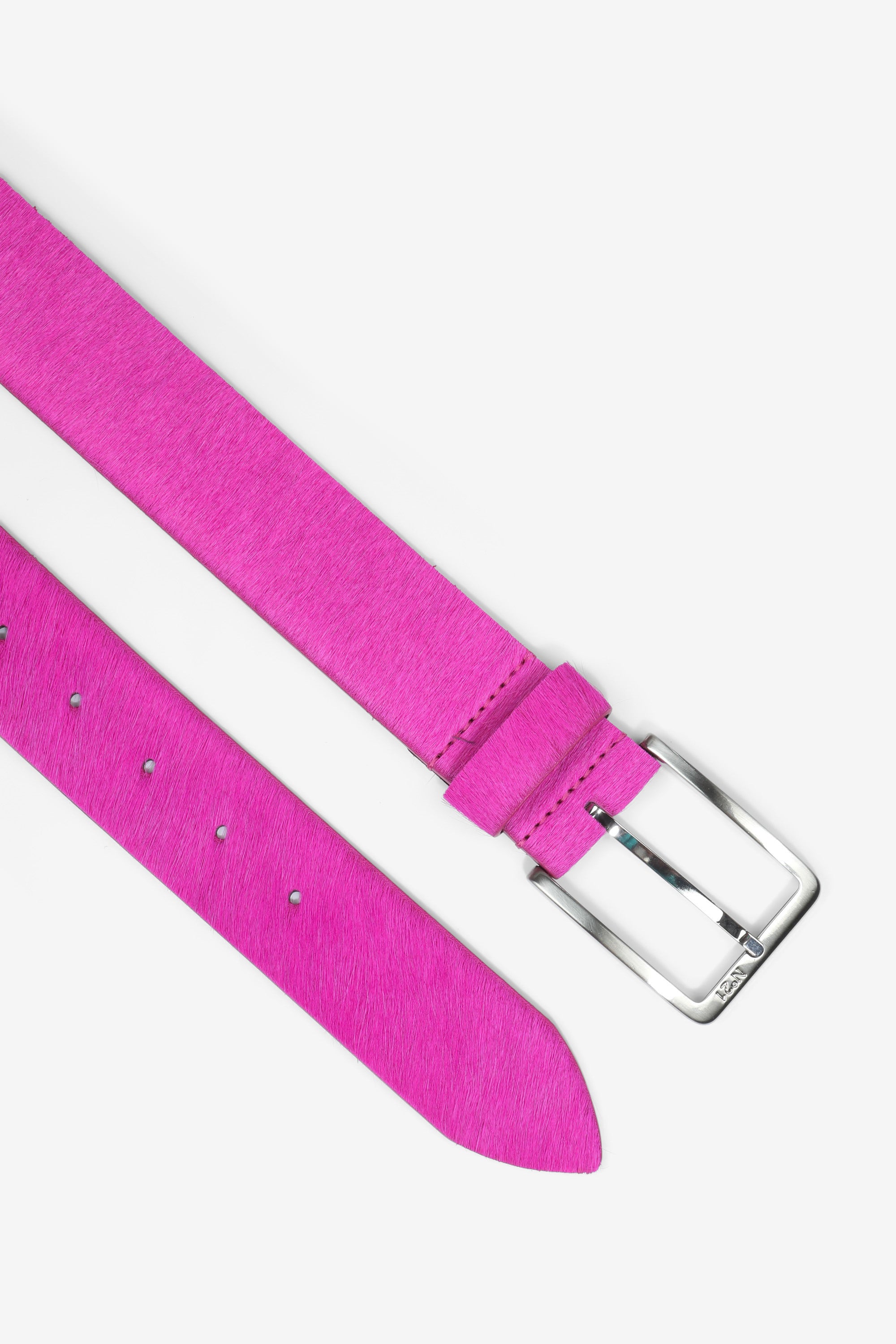 Cintura in cavallino rosa. Il lato esterno è in cavallino rosa e il retro è nero. Fibbia metallica argentata e fori di regolazione lungo il cinturino. Costruzione a cinturino singolo senza elementi aggiuntivi.