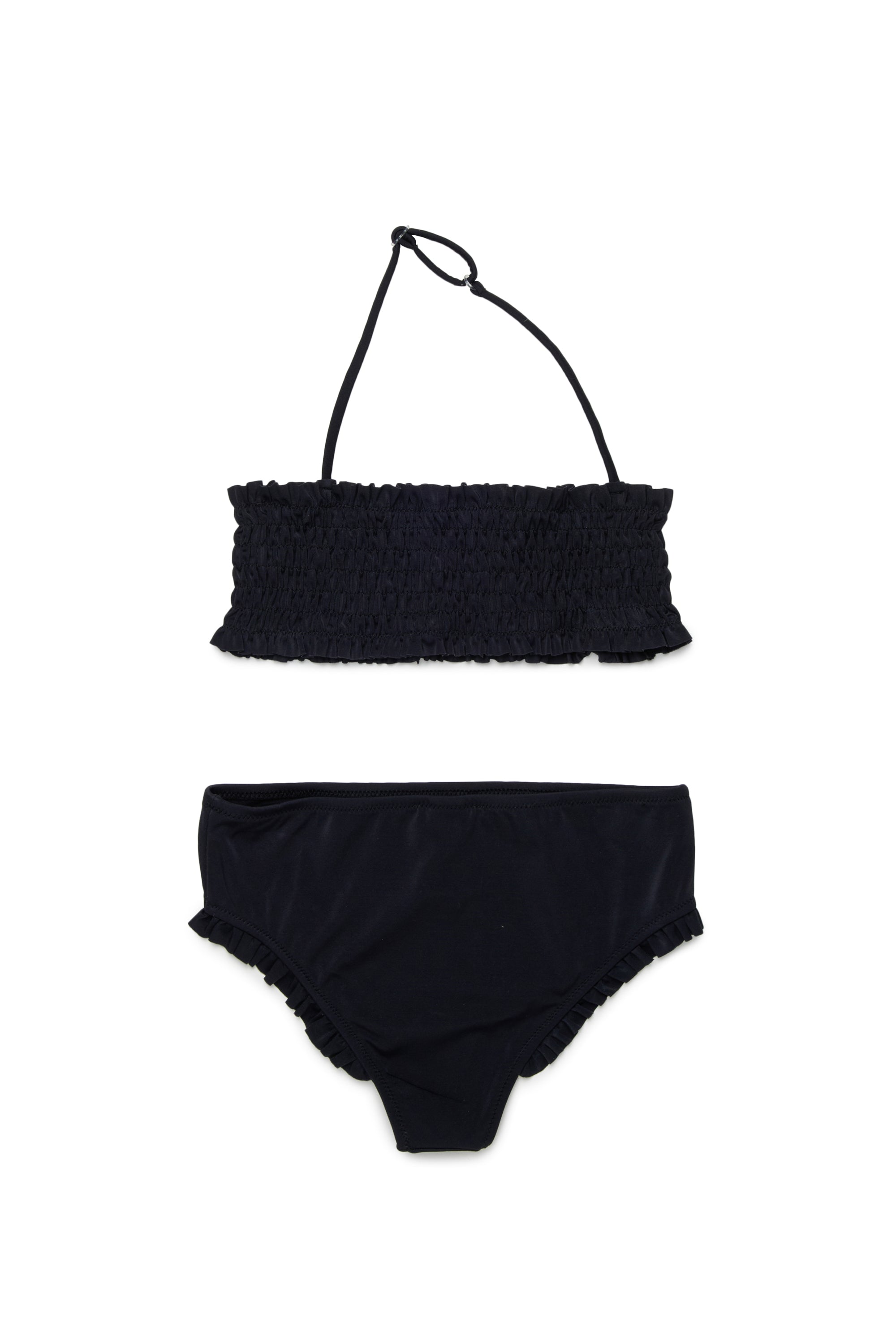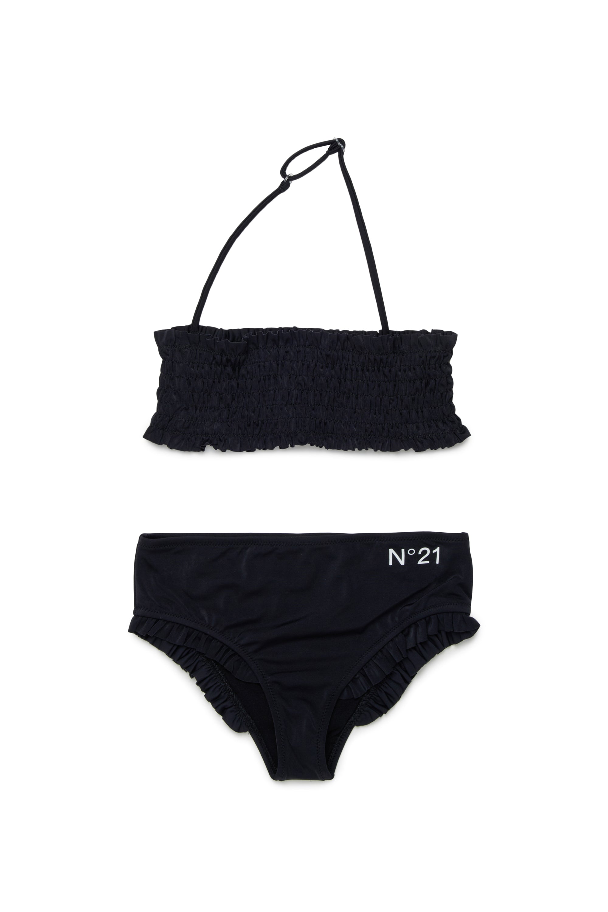 Costume da bagno, due pezzi, in nero. Il top è arricciato, a fascia, con una spallina che si lega al collo. La mutanda a vita alta presenta bordi a ruches. Sul fianco dello slip è presente la stampa "N°21".