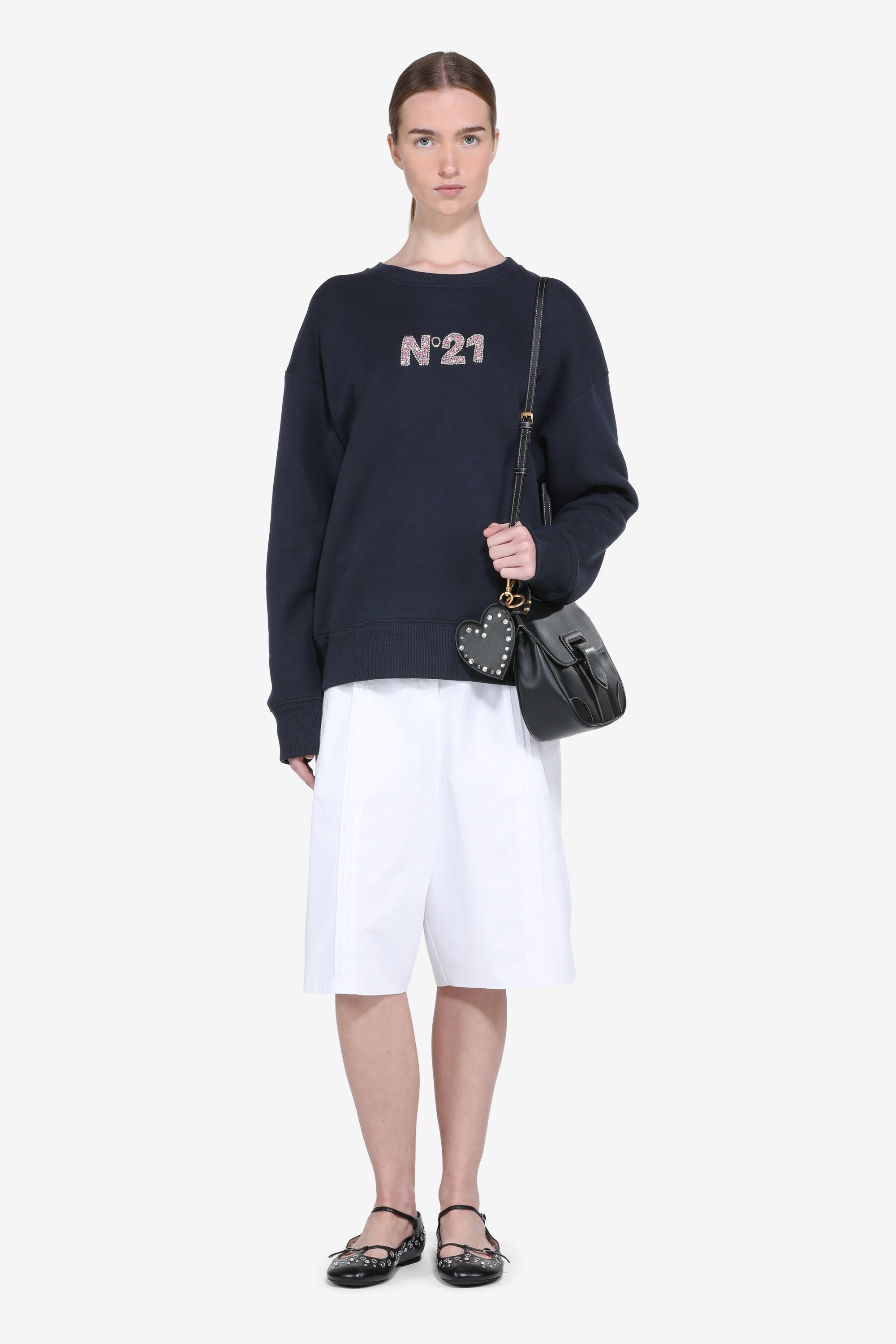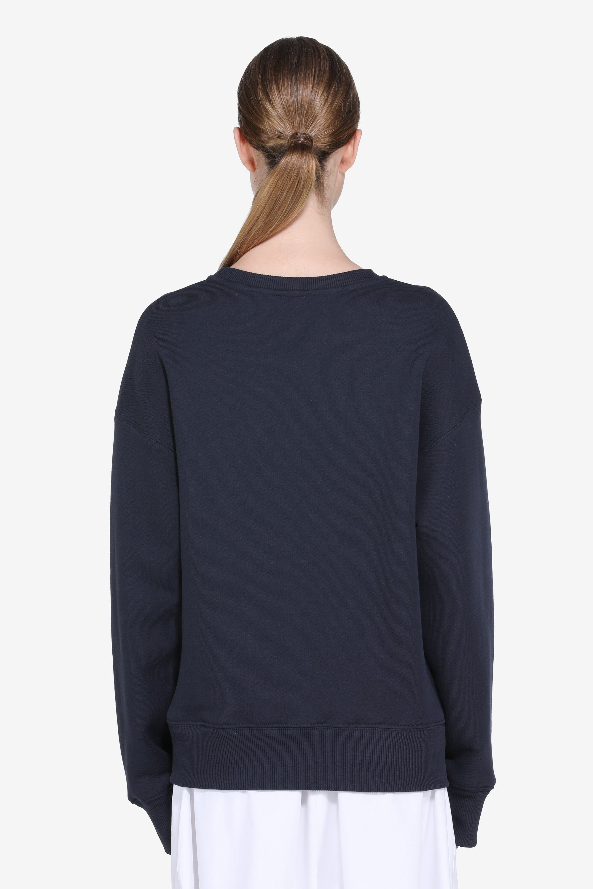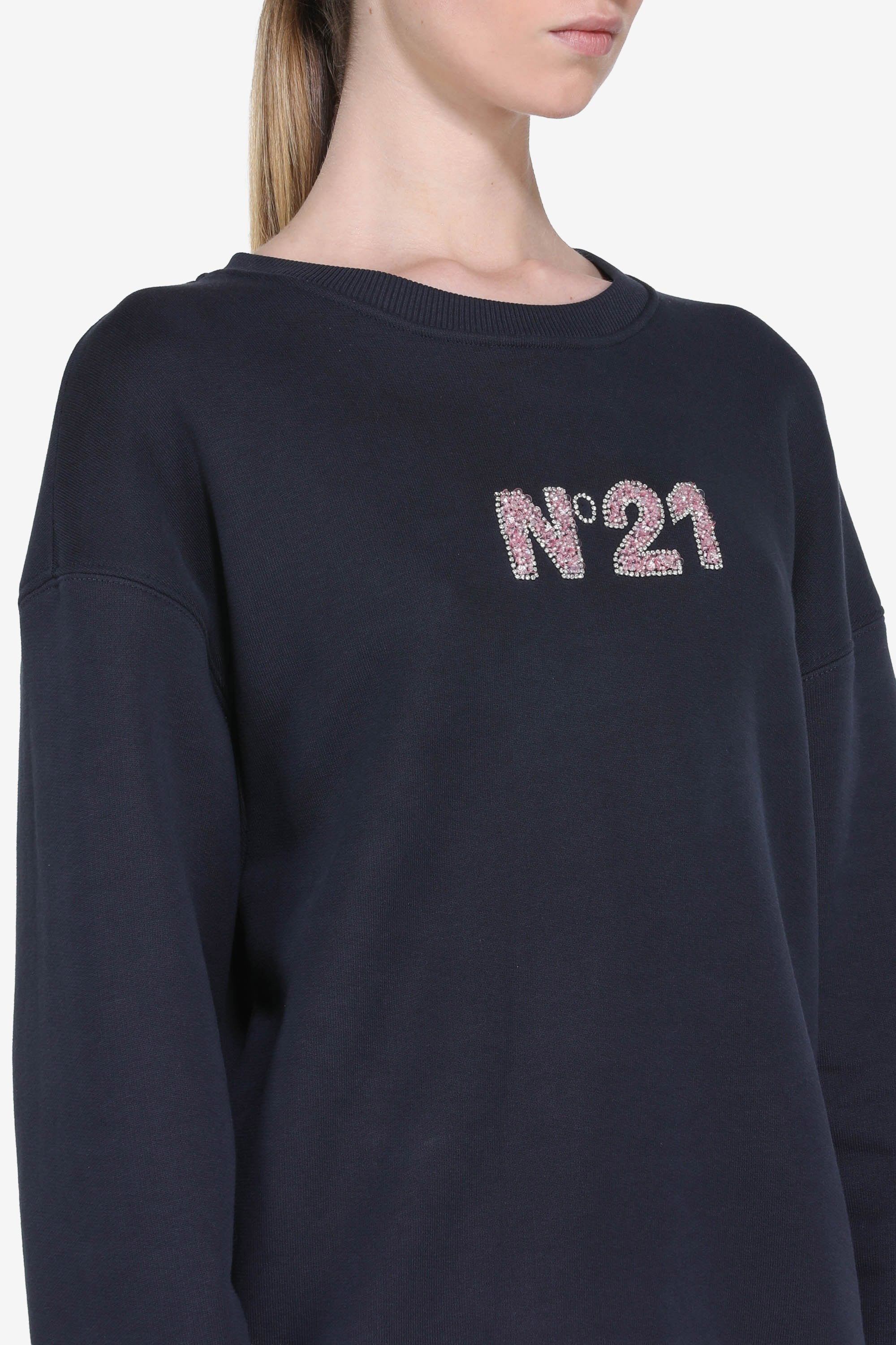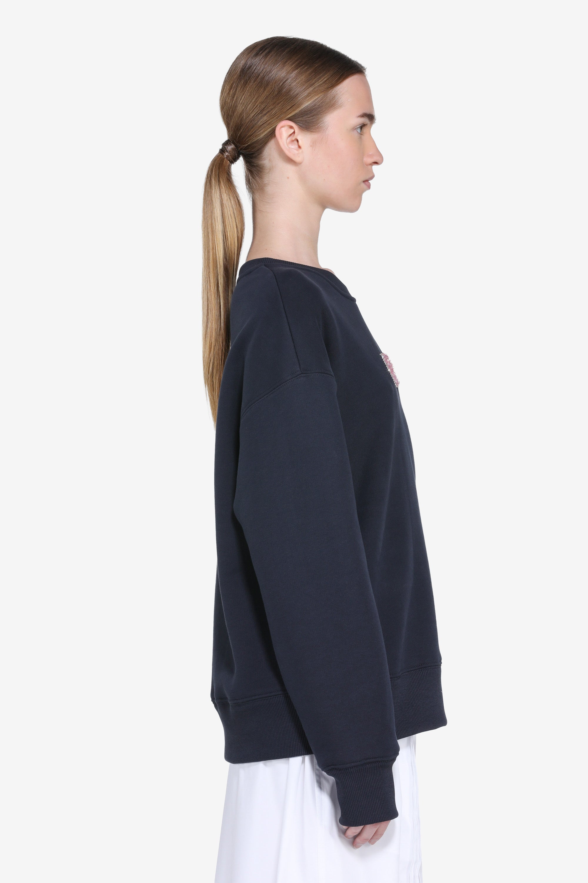 Felpa a maniche lunghe con scollo tondo. Colore blu navy. Presenta un logo sul petto realizzato con paillettes a contrasto. Taglio dritto, con bordi a costine su collo, polsi e fondo.