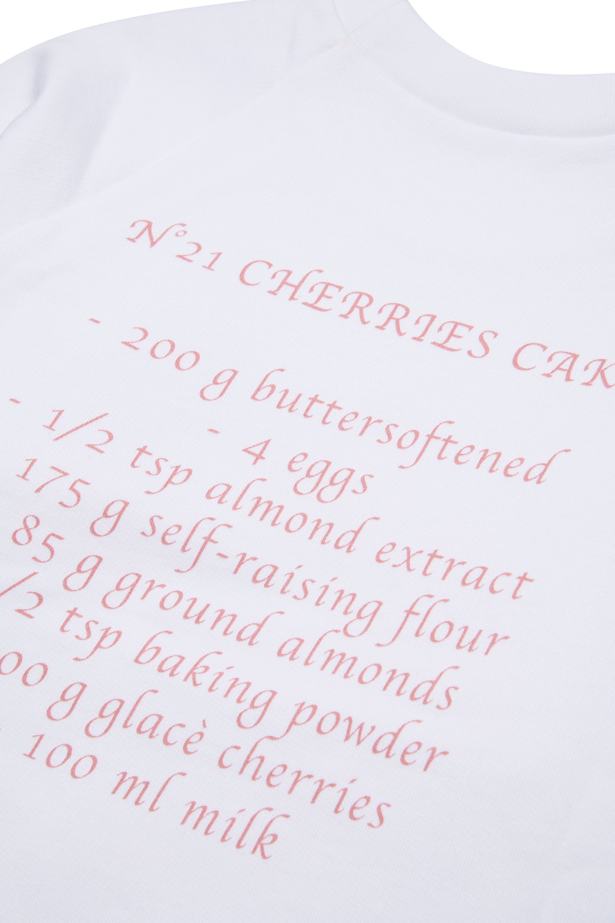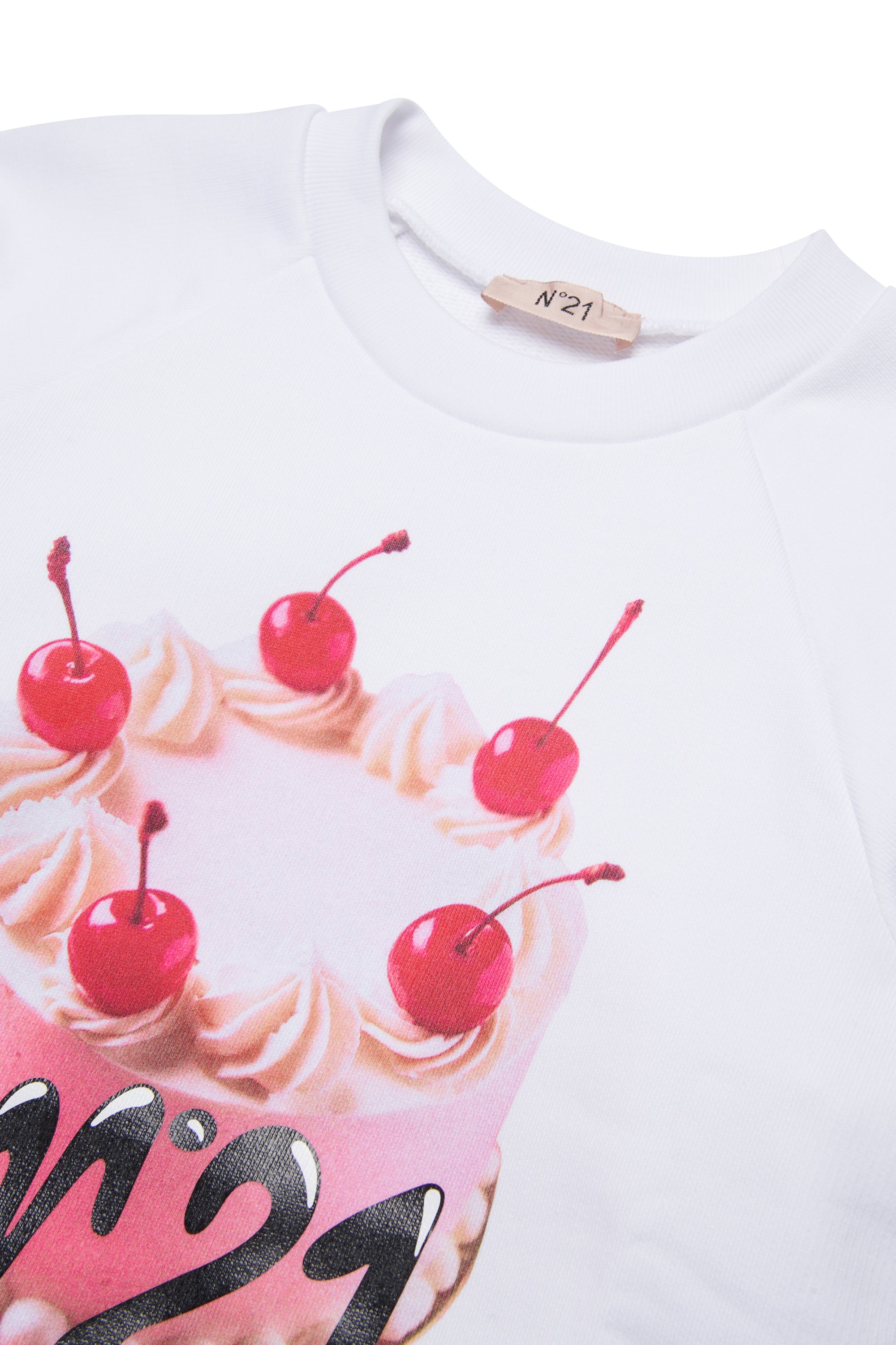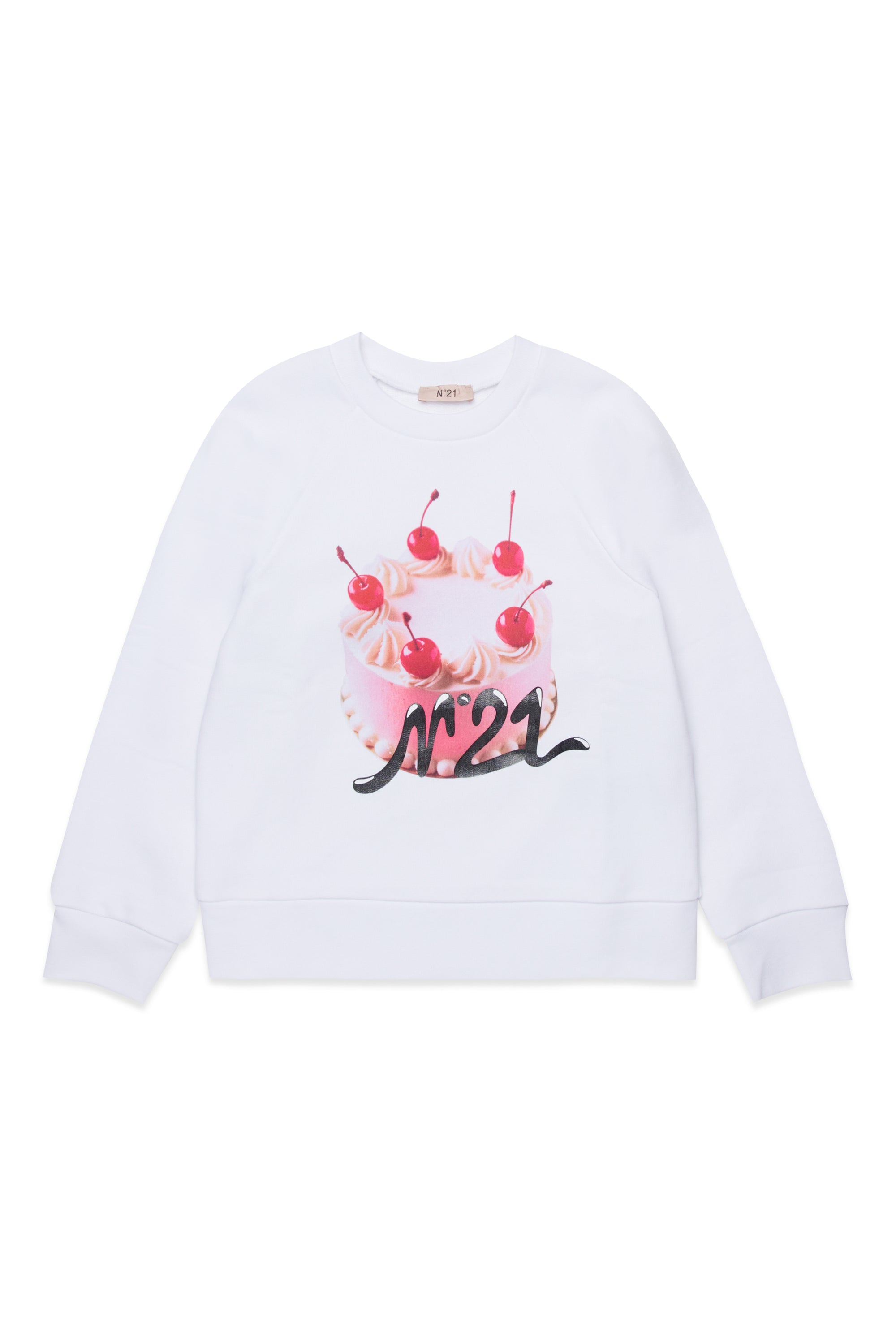 Felpa maniche corte di colore bianco. Presenta una stampa frontale raffigurante una torta decorata con ciliegie. La costruzione include bordo inferiore e polsini a costine, con collo rotondo. Il taglio è classico, pensato per un uso quotidiano.