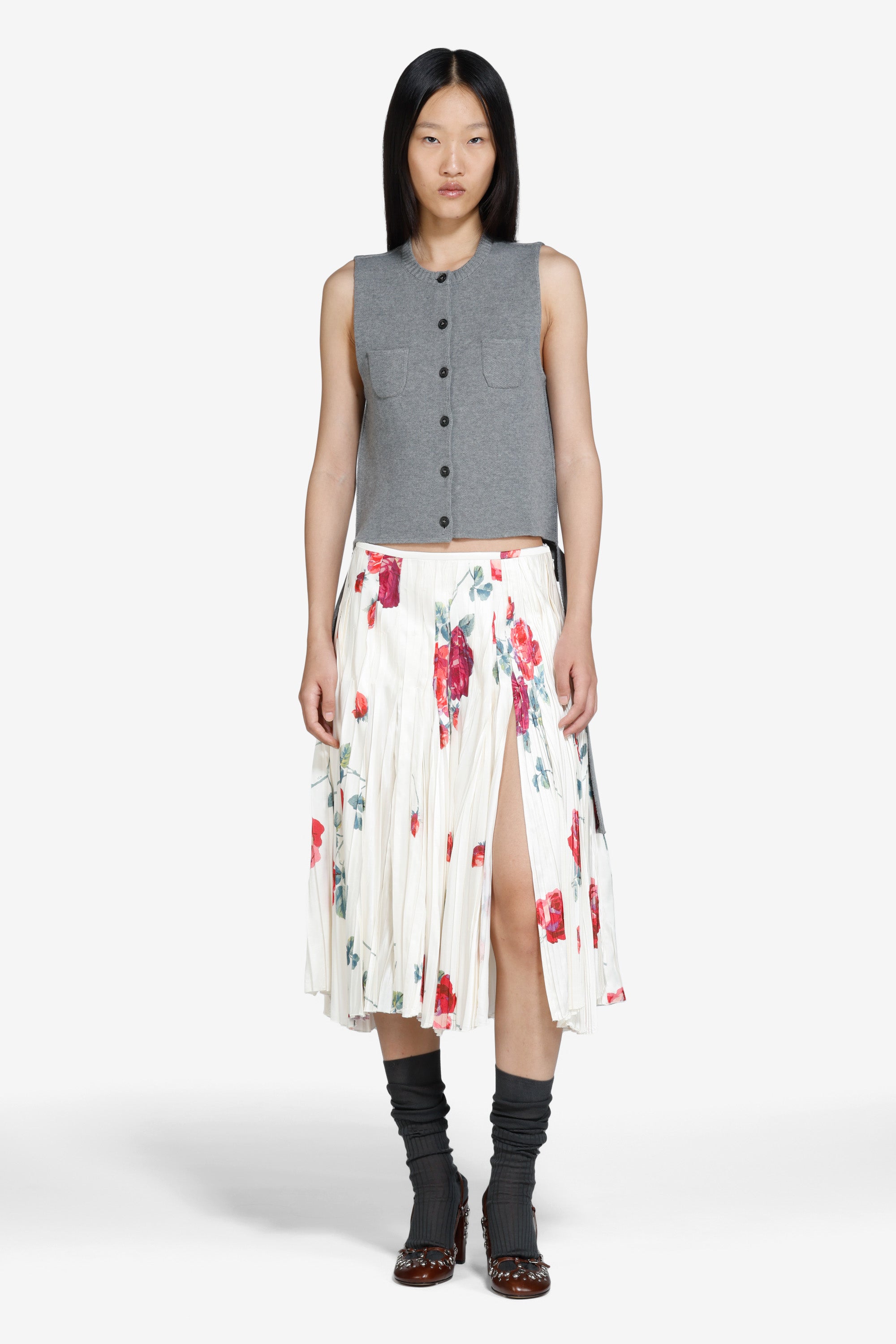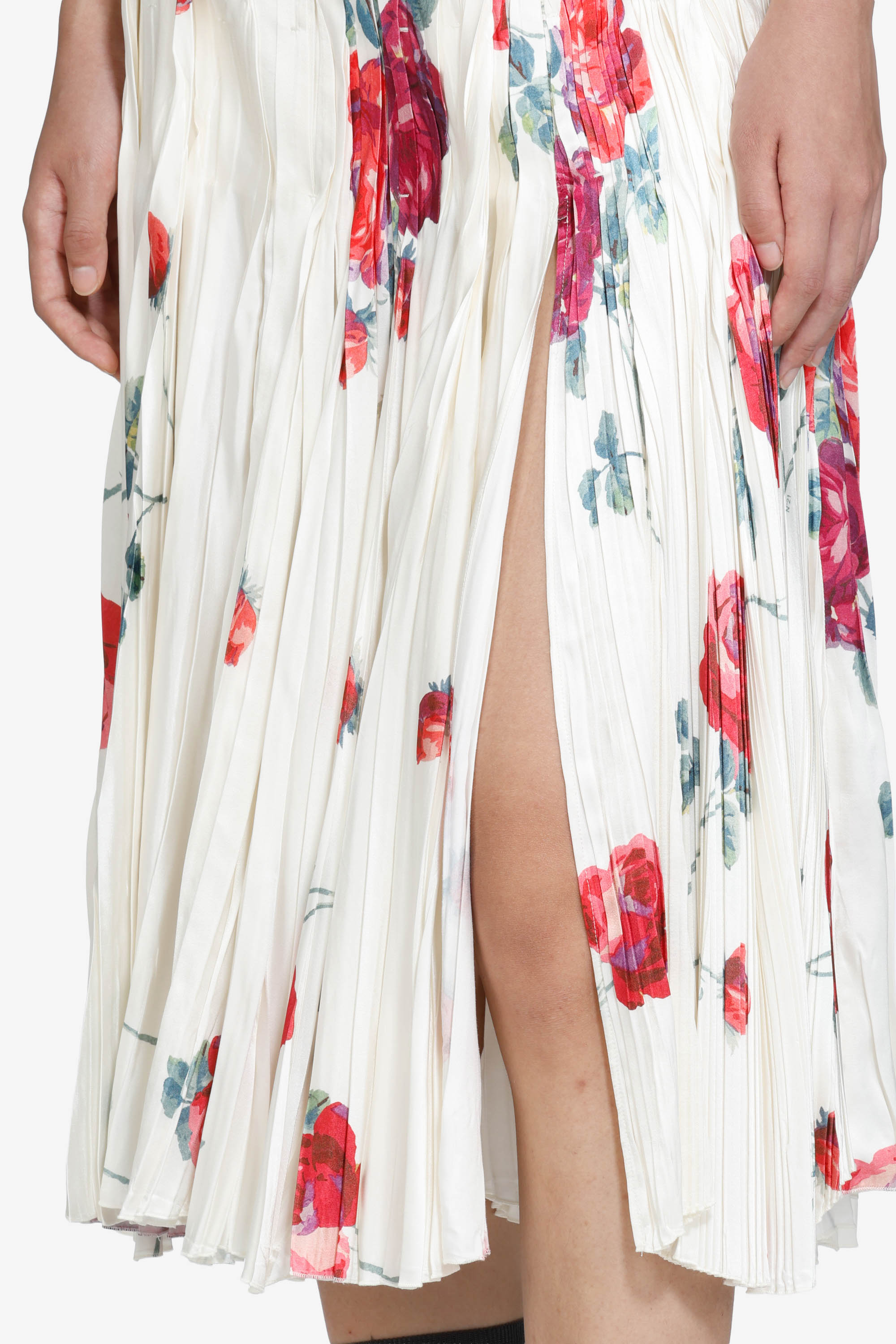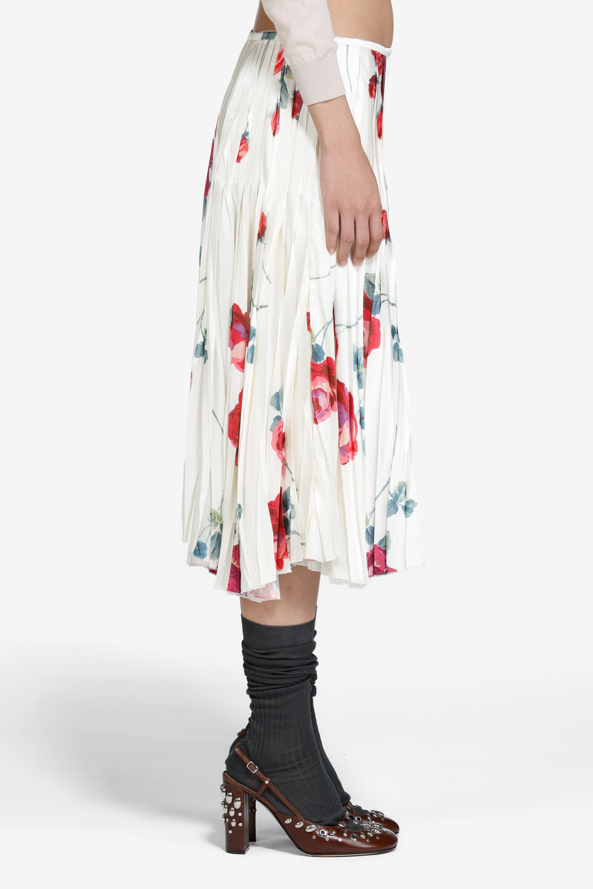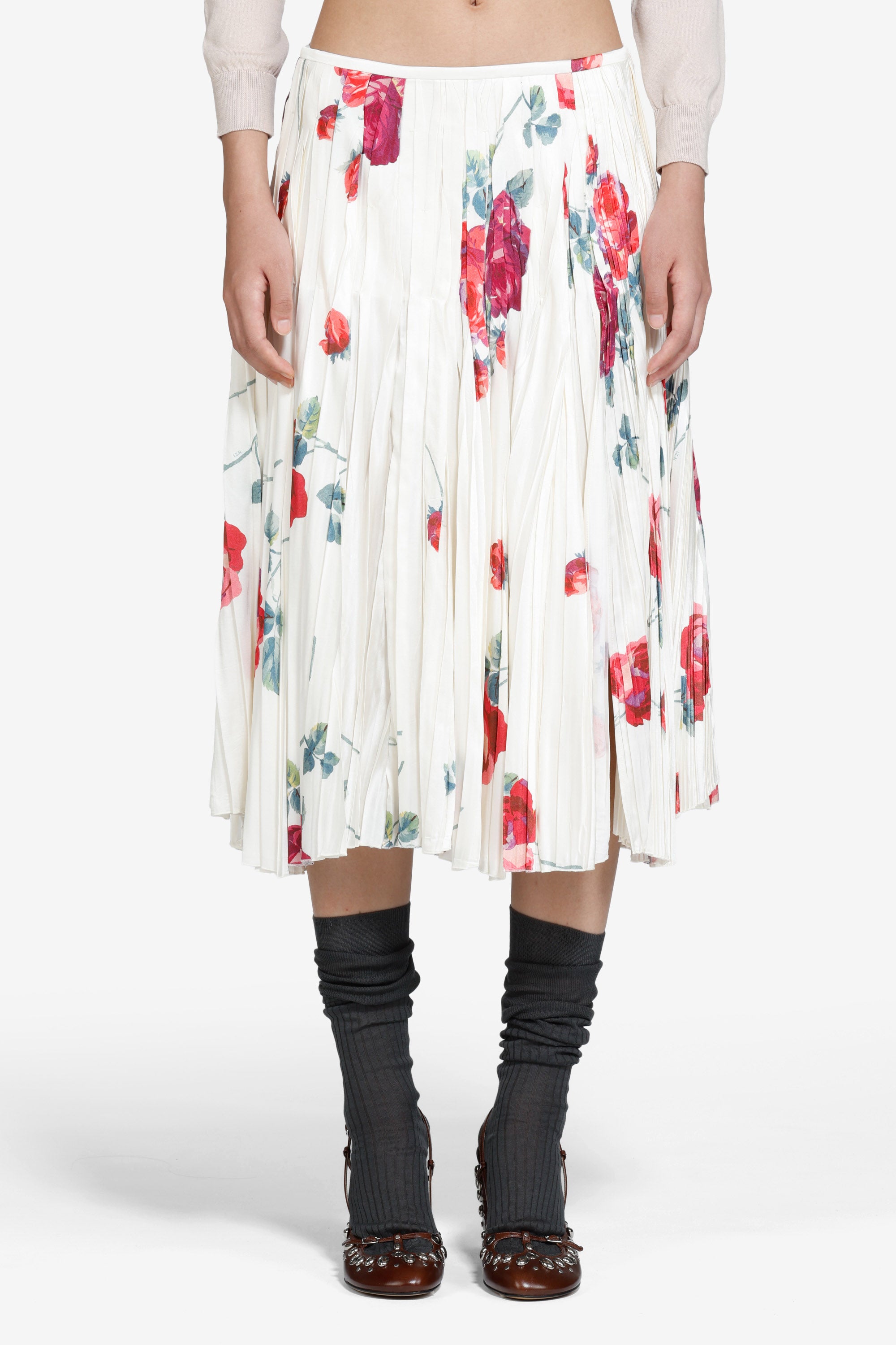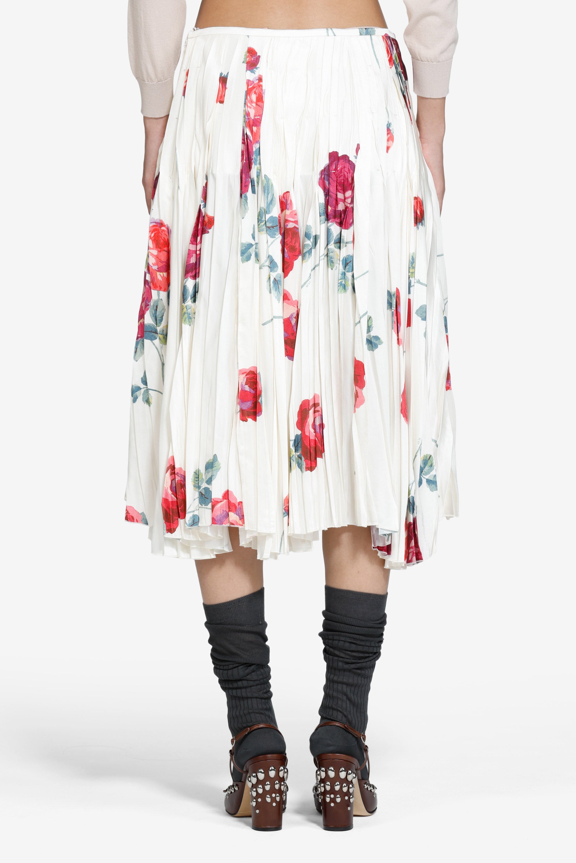 Gonna plissettata con stampa a rose, taglio sotto il ginocchio e pieghe verticali che definiscono la silhouette. Il tessuto leggero offre movimento e caduta fluida. La stampa floreale presenta rose rosse e verdi su sfondo chiaro. Vita media.
