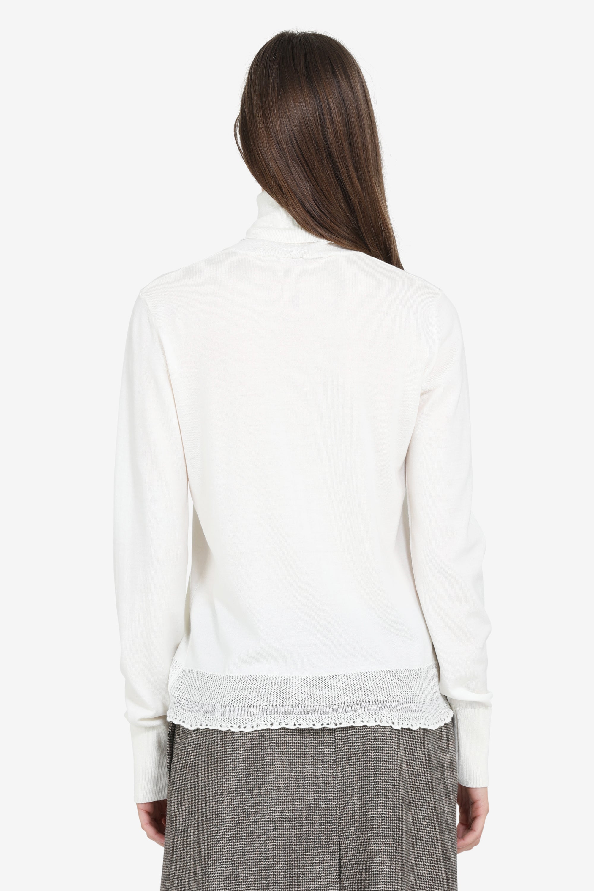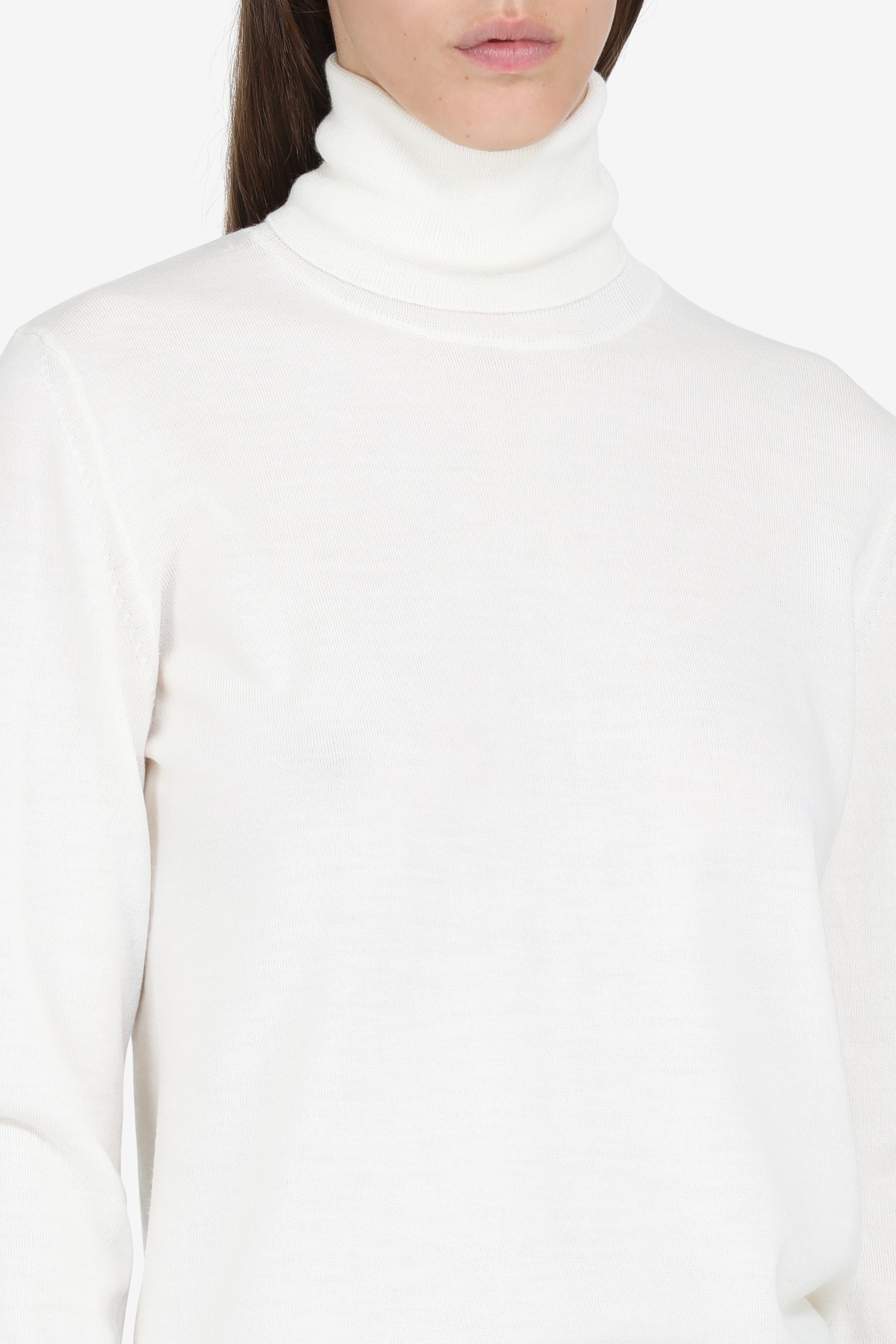 Maglia a collo alto con maniche lunghe, colore bianco. Il tessuto a maglia ha una vestibilità regolare. L’orlo presenta una fascia a maglia aperta con bordo a onda. I polsini sono a costine; design semplice e neutro, ideale per layering.