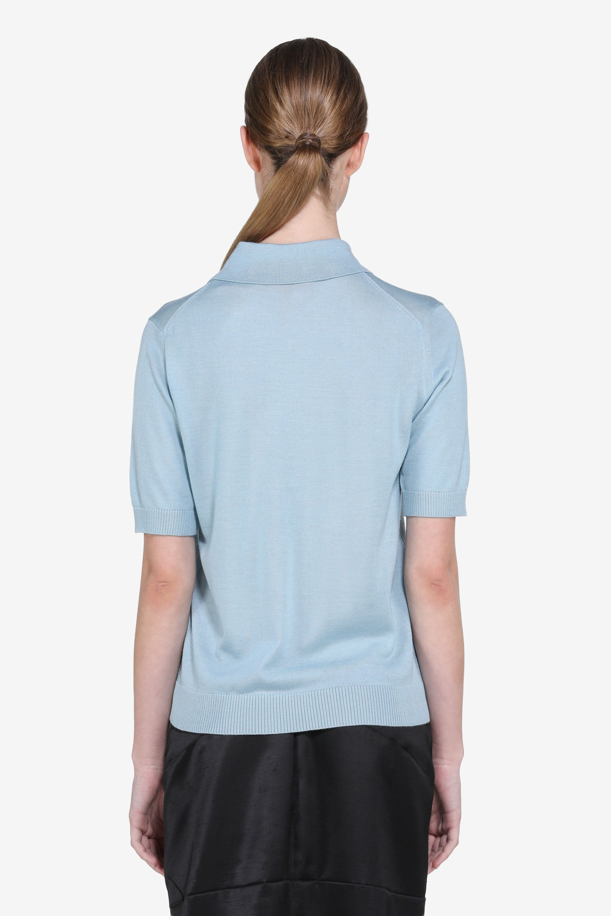 Maglia a polo a maniche corte in maglia di colore azzurro chiaro. Colletto polo classico e chiusura frontale con bottoni. Le maniche sono finite con polsini a coste e il fondo è rifinito a coste. Il taglio è regolare e minimale.