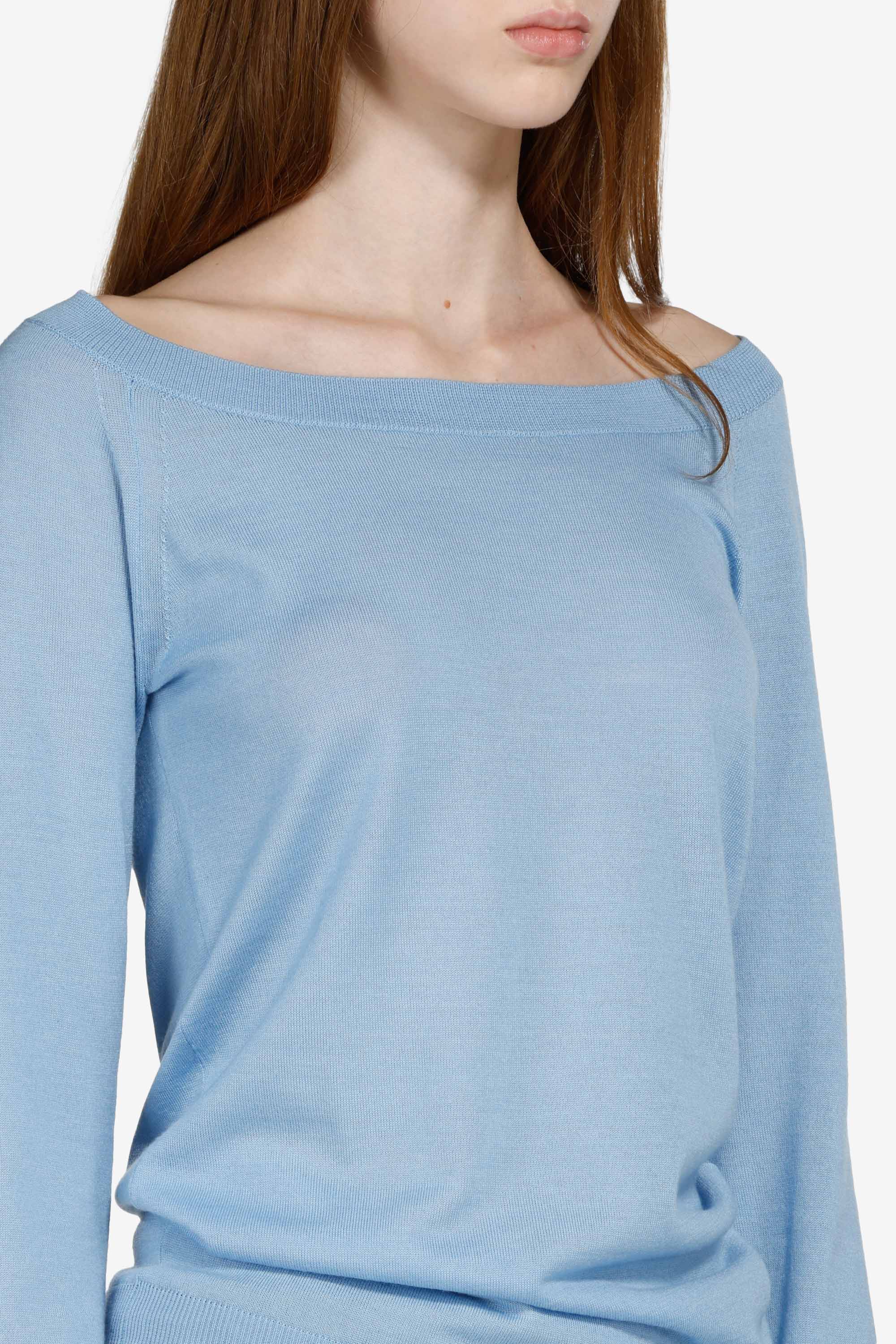 Maglia a maniche lunghe con scollo a barca. Colore azzurro. Taglio regular che segue la linea del corpo senza essere aderente. Il bordo inferiore e i polsini in tessuto a coste completano la finitura della maglia.