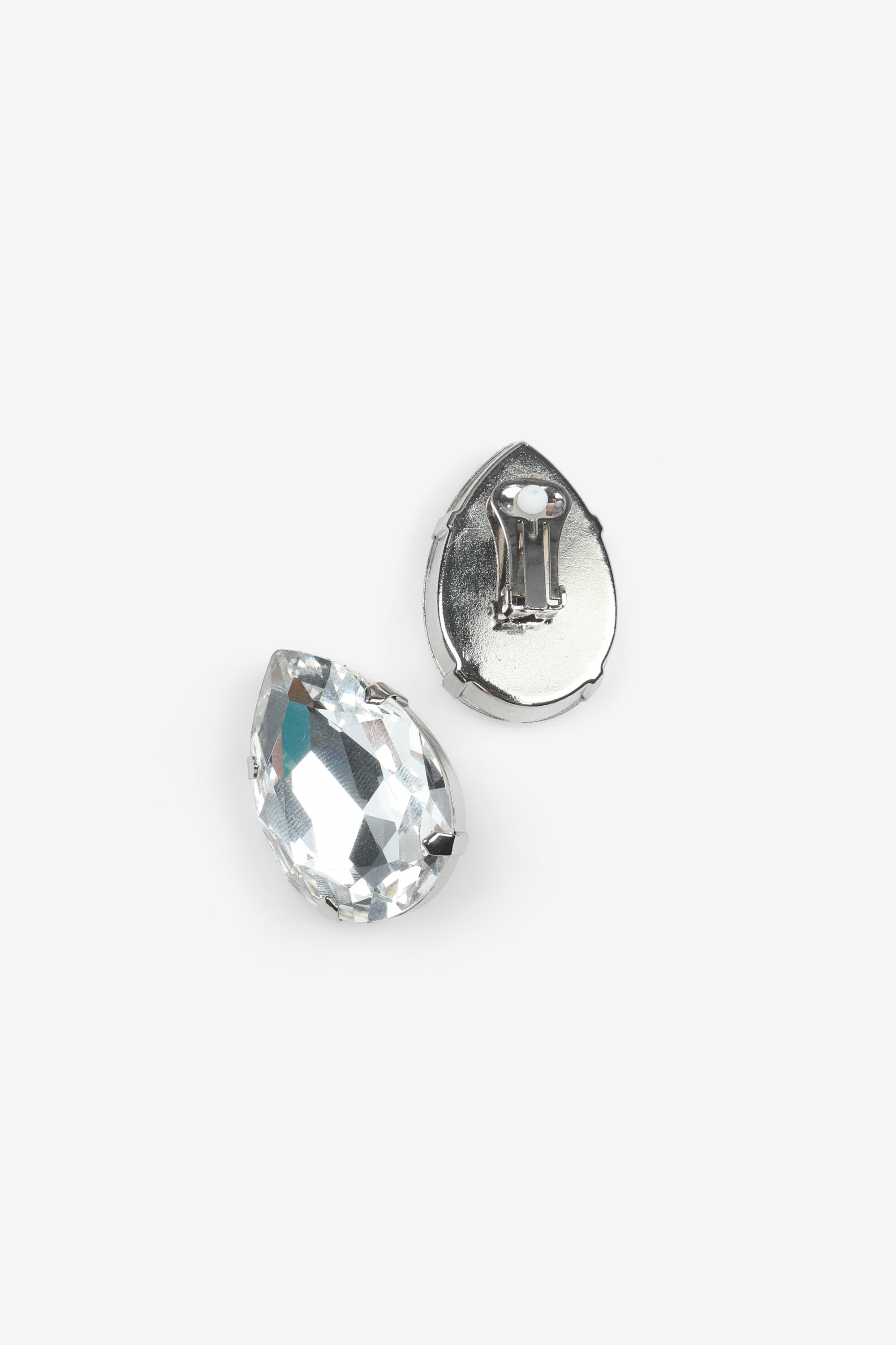 Orecchini in metallo con maxi cristallo trasparente a goccia. La pietra è taglio faccettato e incastonata in una montatura metallica argentata. La chiusura sul retro è a clip. La finitura lucida e il design sobrio li rendono adatti a occasioni formali.