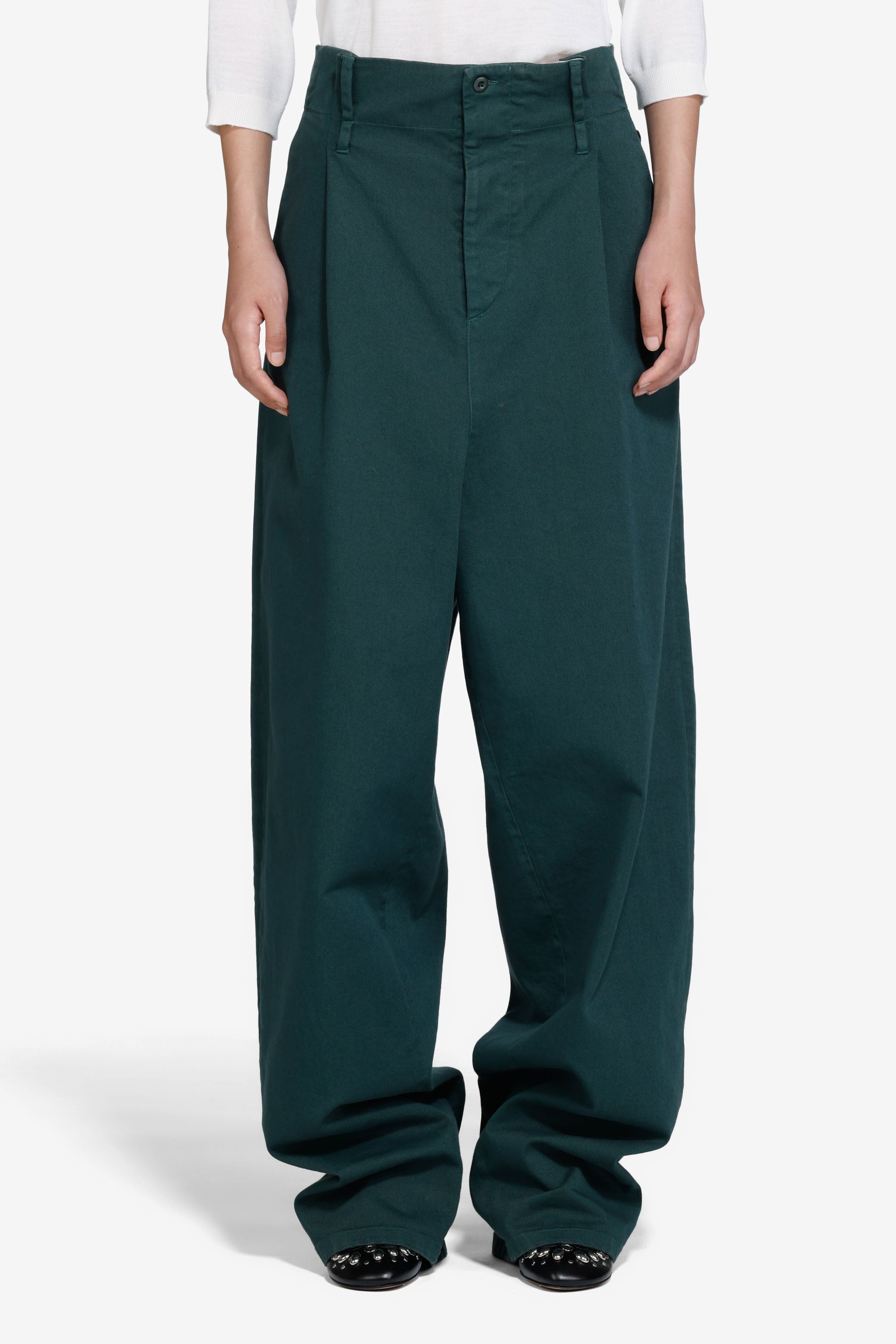 Pantalone lungo oversize in verde, realizzato in tessuto di cotone. Vita alta con passanti e cintura, chiusura frontale con bottone e zip. Gamba ampia che forma una silhouette cadente, con pieghe sul fronte.