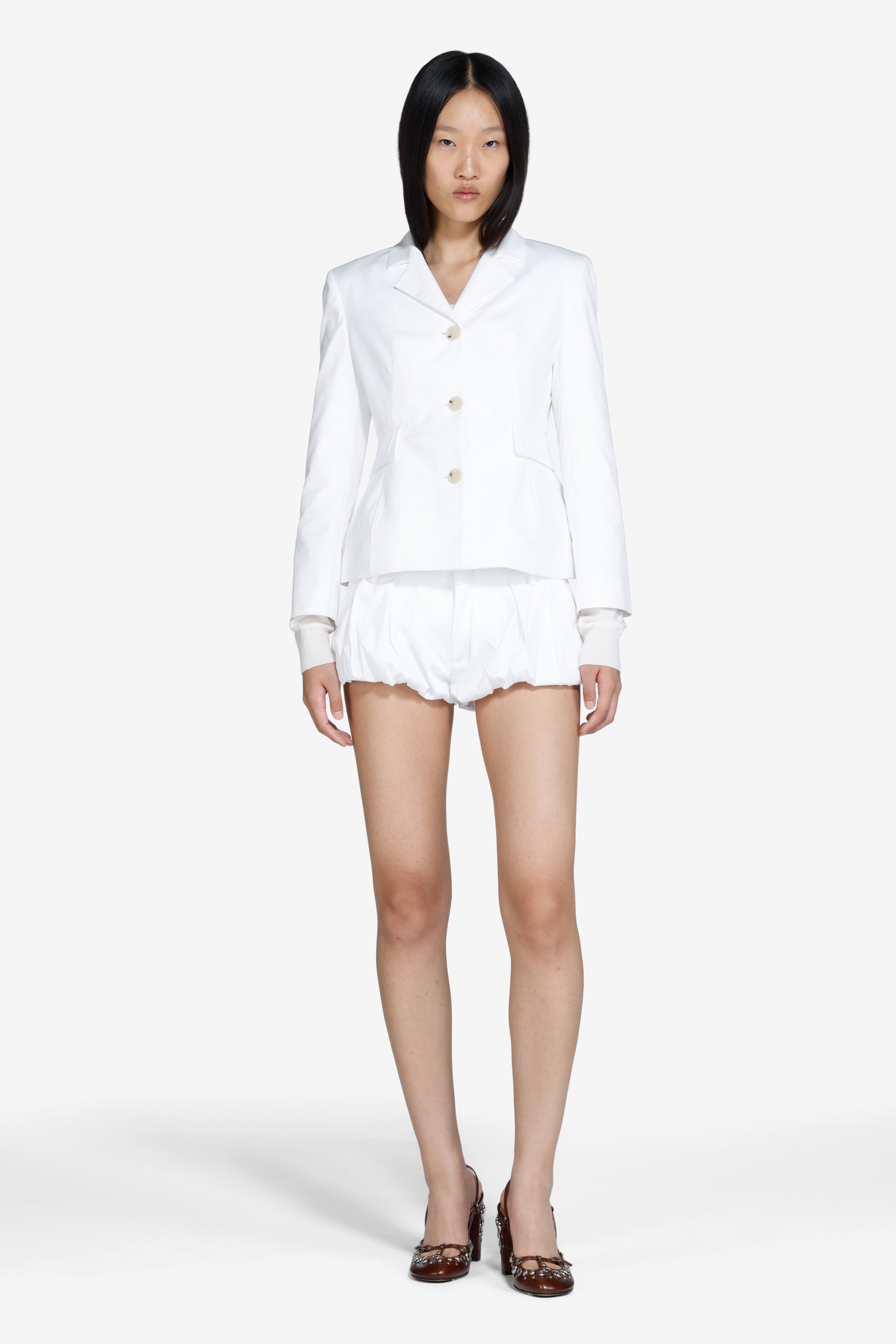 Shorts a palloncino, corto, con silhouette gonfia e orlo arricciato. Colore bianco uniforme. Vestibilità corta con volume che caratterizza la parte inferiore. Due tasche laterali.