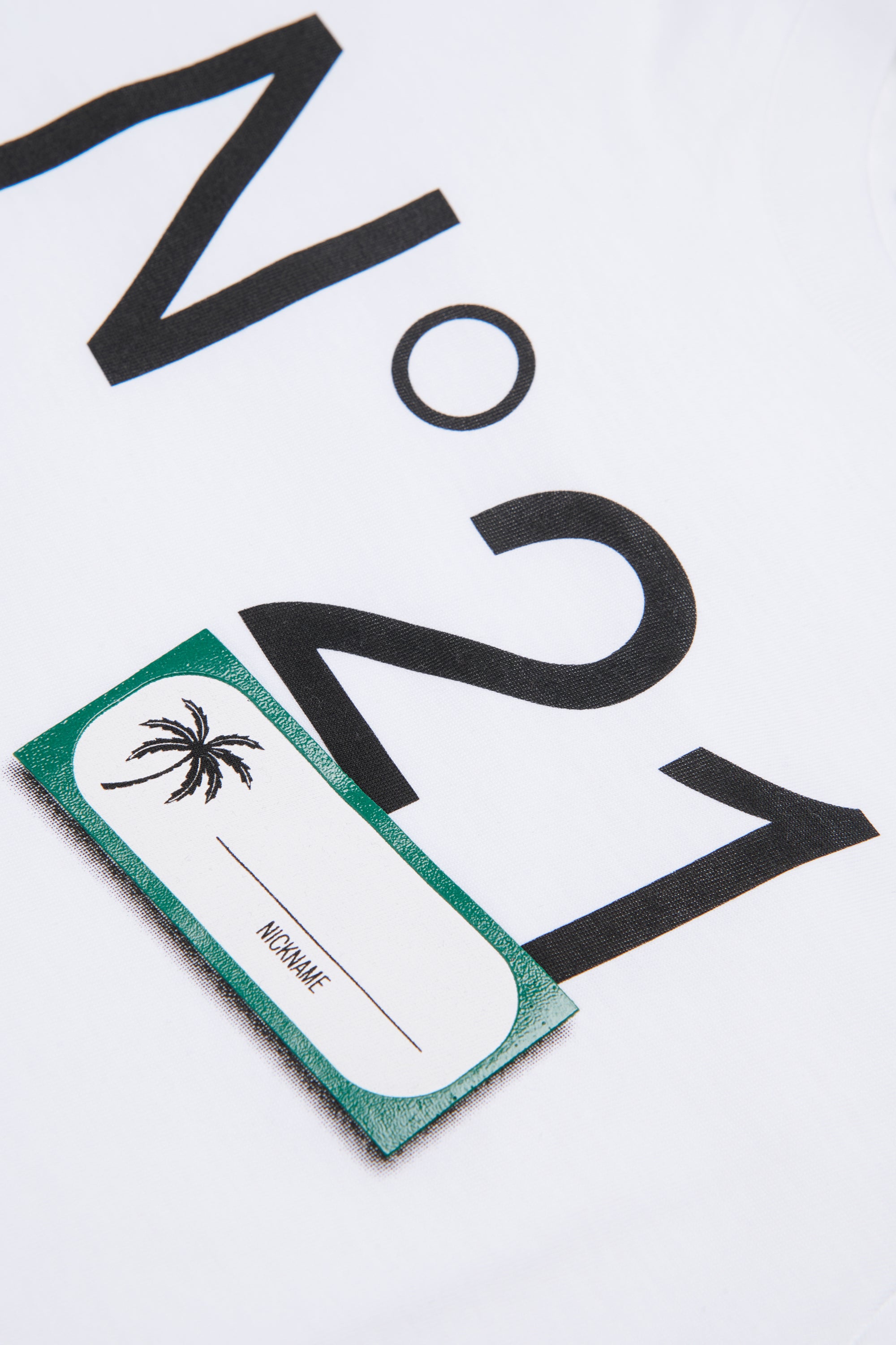 Maglietta a maniche corte, colore bianco. Presenta un logo stampato sul fronte. È realizzata con cuciture standard e costruzione semplice. Include un’etichetta personalizzabile a penarello.