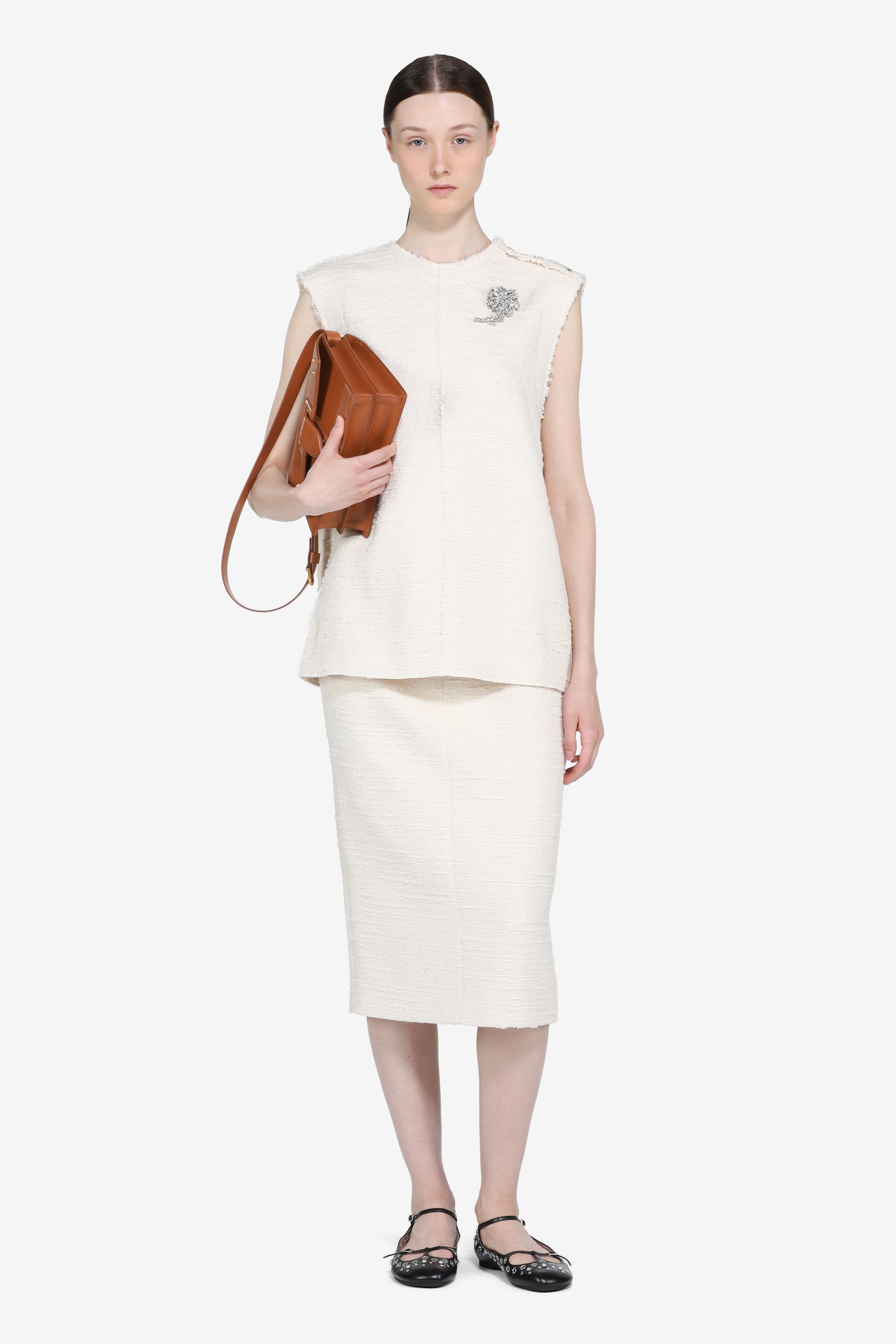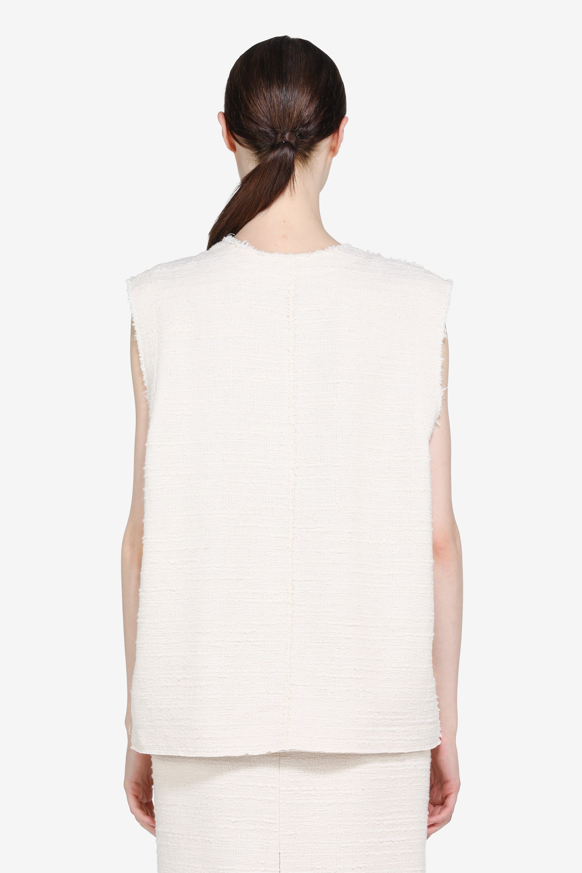 Top senza maniche realizzato in tessuto bouclé testurizzato color avorio. Vestibilità comoda e rilassata, con lunghezza ai fianchi. Il contorno del collo presenta un bordo grezzo sfrangiato e i bordi laterali hanno la stessa finitura. La trama bouclé conferisce una superficie irregolare al capo.