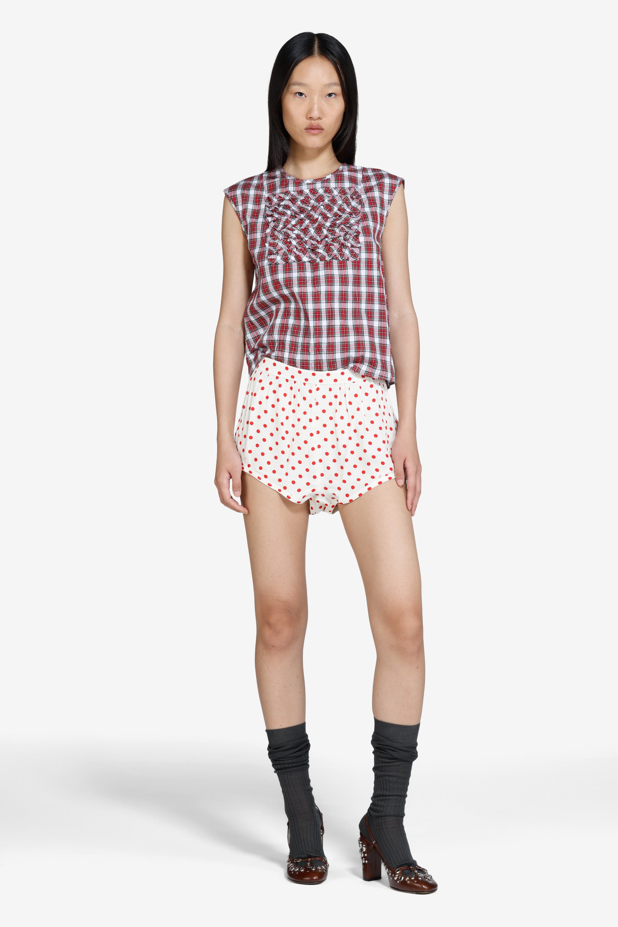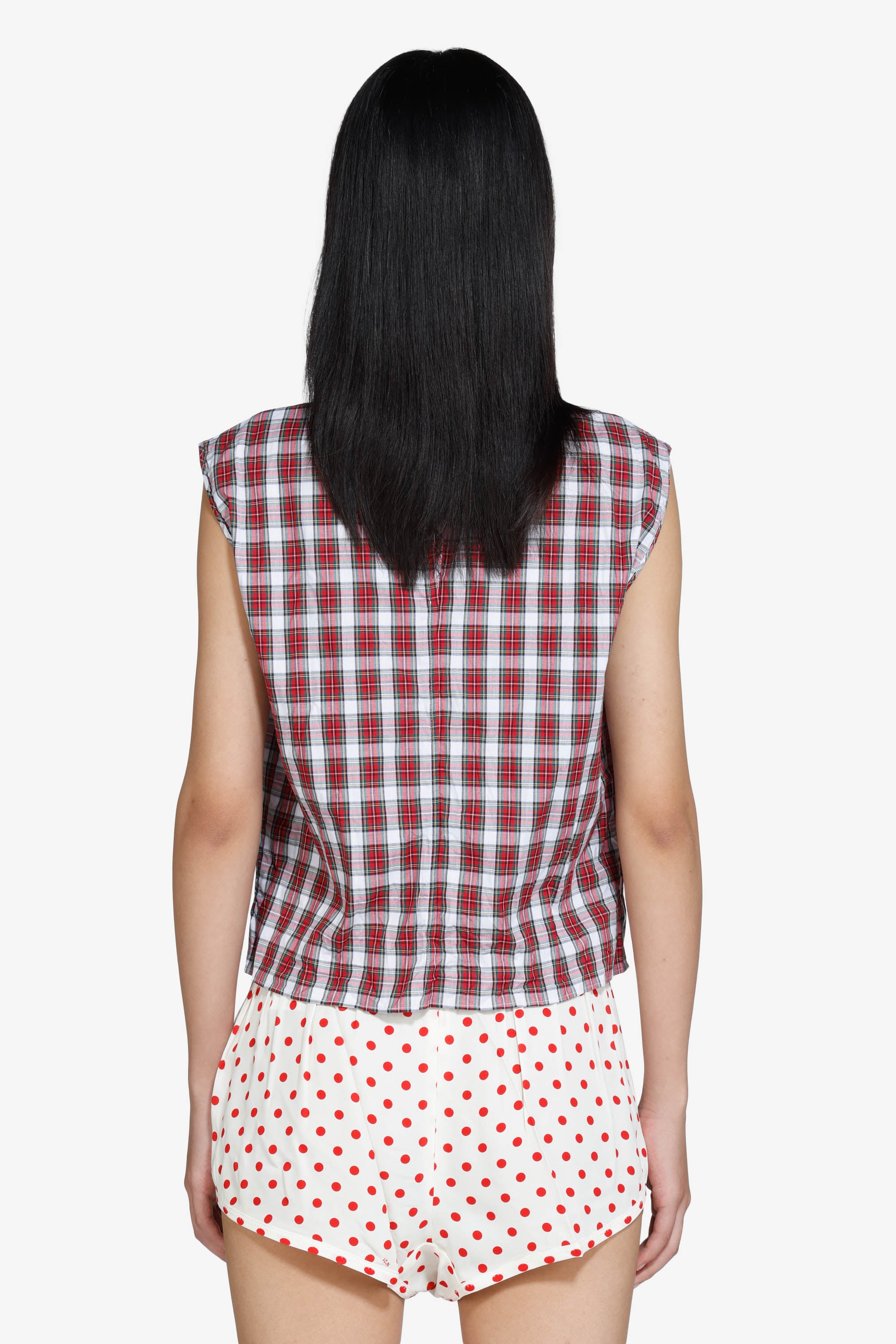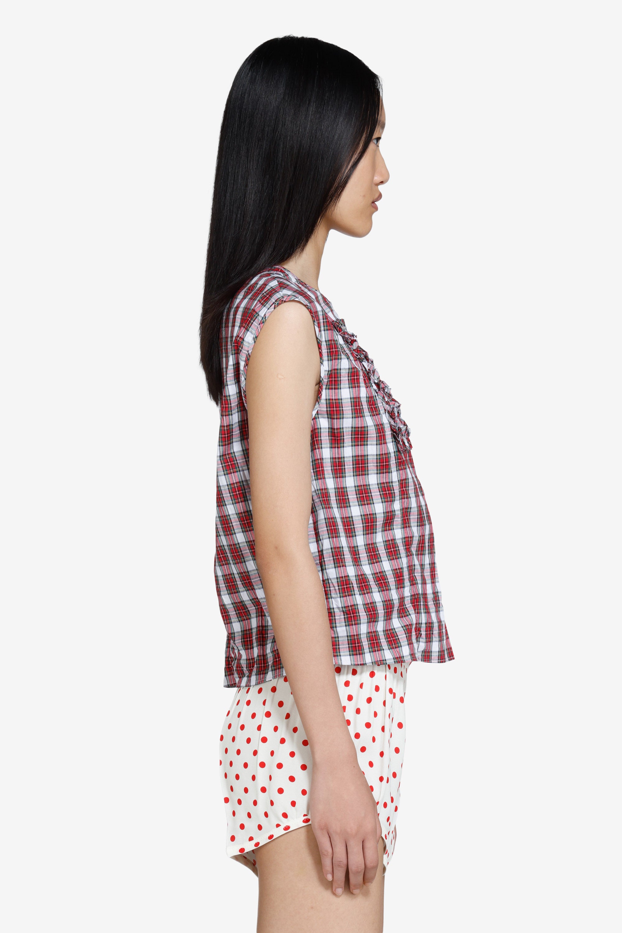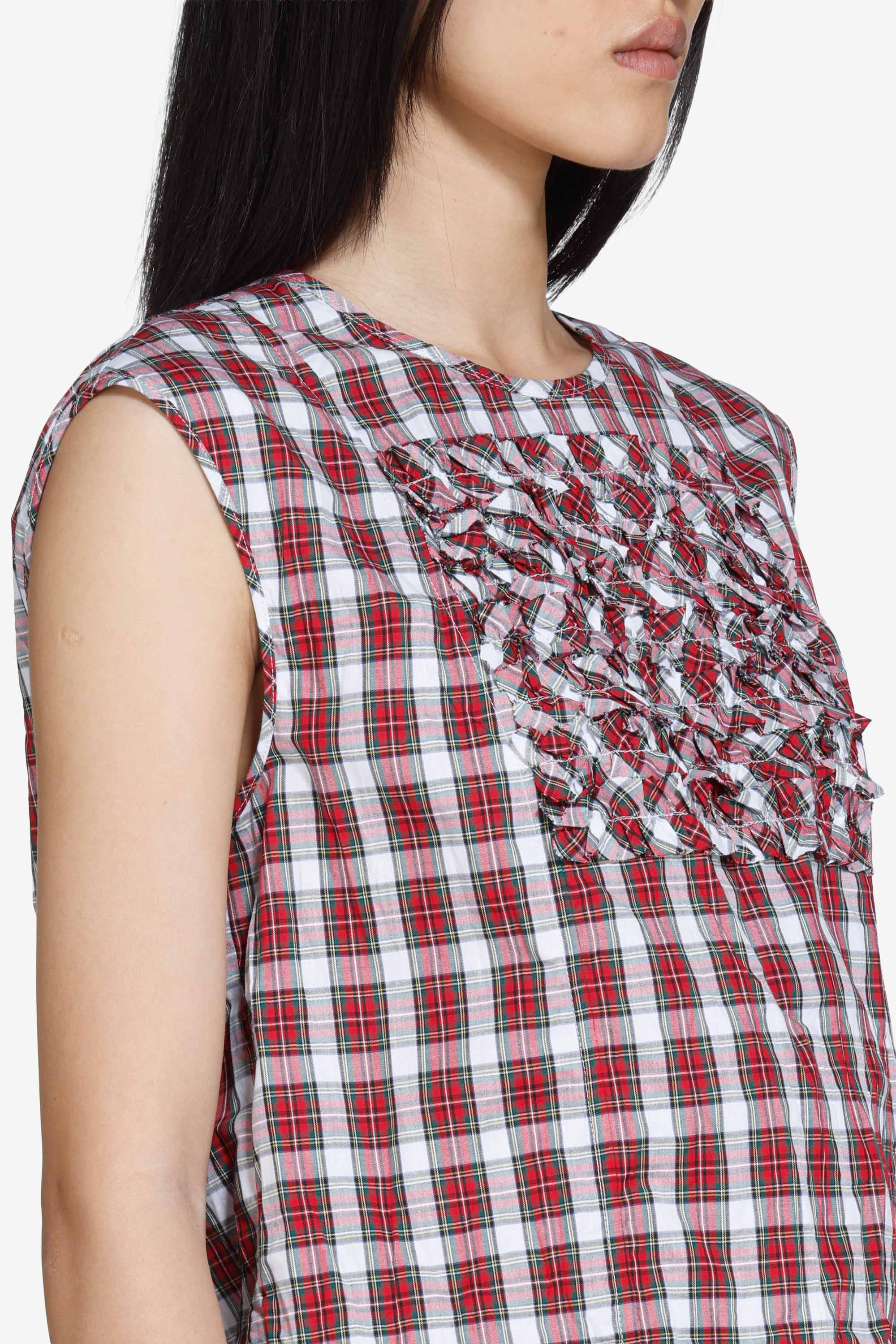 Top smanicato a quadretti rosso e bianco con taglio dritto. Sulla parte frontale presenta un pannello con lavorazione a ruches, creando rilievo sul tessuto. La lunghezza è corta. Il capo arriva al girovita e l’orlo è rifinito con bordi puliti.